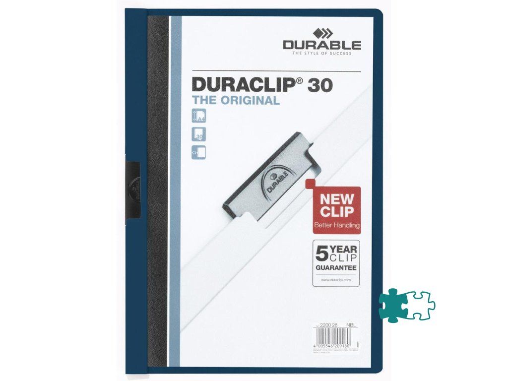 Obal vyvinutý spoločnosťou DURABLE pre viazanie nedierovaných listov. Materiál z PVC s unikátnym kovovým klipom, ktorý sa prispôsobí vloženému počtu listov a priehľadnou prednou stranou. Ideálny na prezentácie, ponuky, správy, poznámky na konferencie, semináre a pod. Formát A4. Kapacita 1-30 listov. Väčšie balenie 25 ks.Kapacita: 1-30 listov