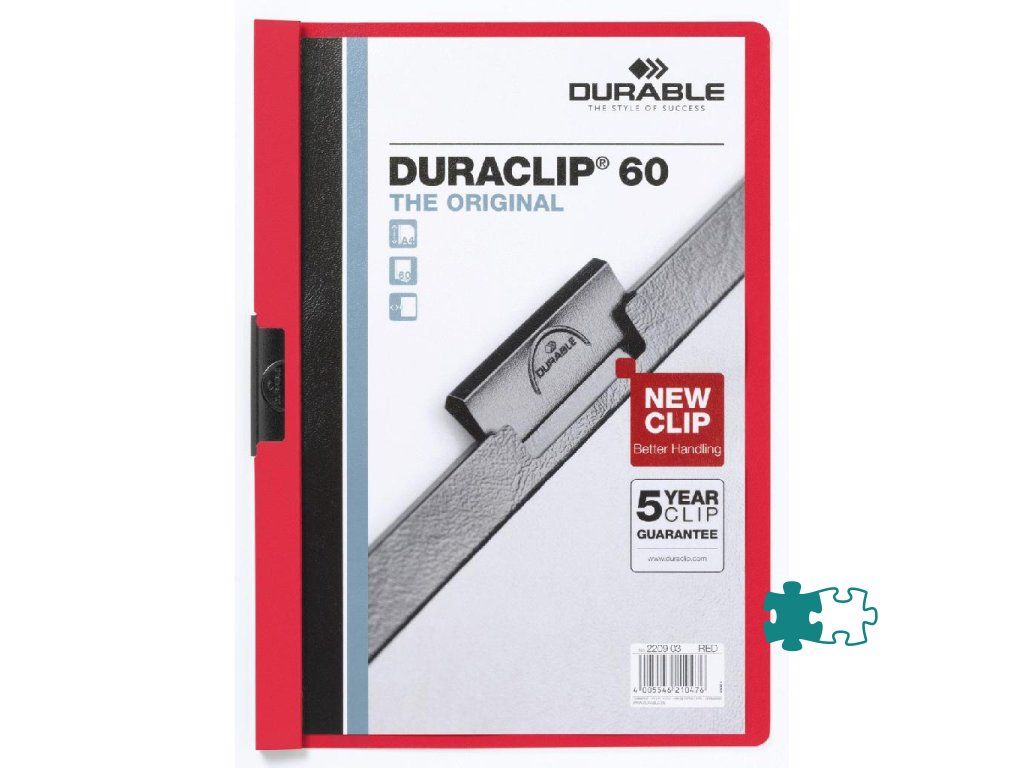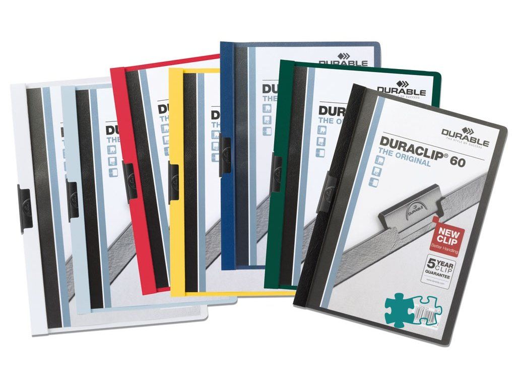 Obal vyvinutý spoločnosťou DURABLE pre viazanie nedierovaných listov. Materiál z PVC s unikátnym kovovým klipom, ktorý sa prispôsobí vloženému počtu listov a priehľadnou prednou stranou. Ideálny na prezentácie, ponuky, správy, poznámky na konferencie, semináre a pod. Formát A4. Kapacita 1-60 listov. Väčšie balenie 25 ks.Kapacita: 1-60 listov
