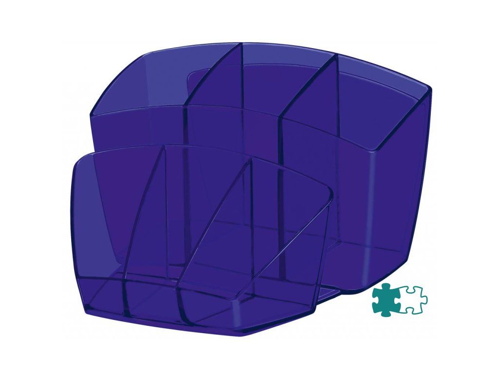 Dômyselne navrhnutý kompaktný a elegantný stolný organizér na kancelárske príslušenstvo. Kapacita: 40 pier, 5 zvýrazňovačov a 3 všeobecné priehradky. Na spodnej časti protišmyková podložka. Celkové rozmery 143 × 158 × 93 mm. 100% recyklovateľný, vysokokvalitný plast. Väčšie balenie 6 ks. Farba transparentná modrá.Dodatočné parametre
