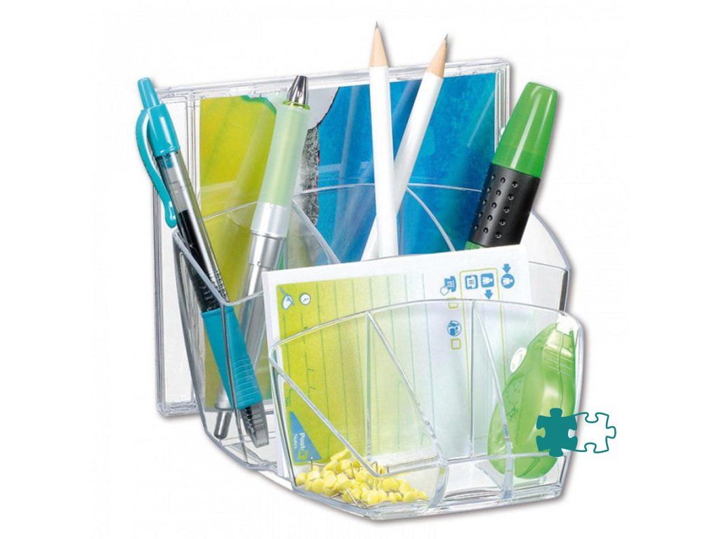 Dômyselne navrhnutý kompaktný a elegantný stolný organizér na kancelárske príslušenstvo. Kapacita: 40 pier, 5 zvýrazňovačov a 3 všeobecné priehradky. Na spodnej časti protišmyková podložka. Celkové rozmery 143 × 158 × 93 mm. 100% recyklovateľný, vysokokvalitný plast. Väčšie balenie 6 ks. Farba transparentná číra.Dodatočné parametre