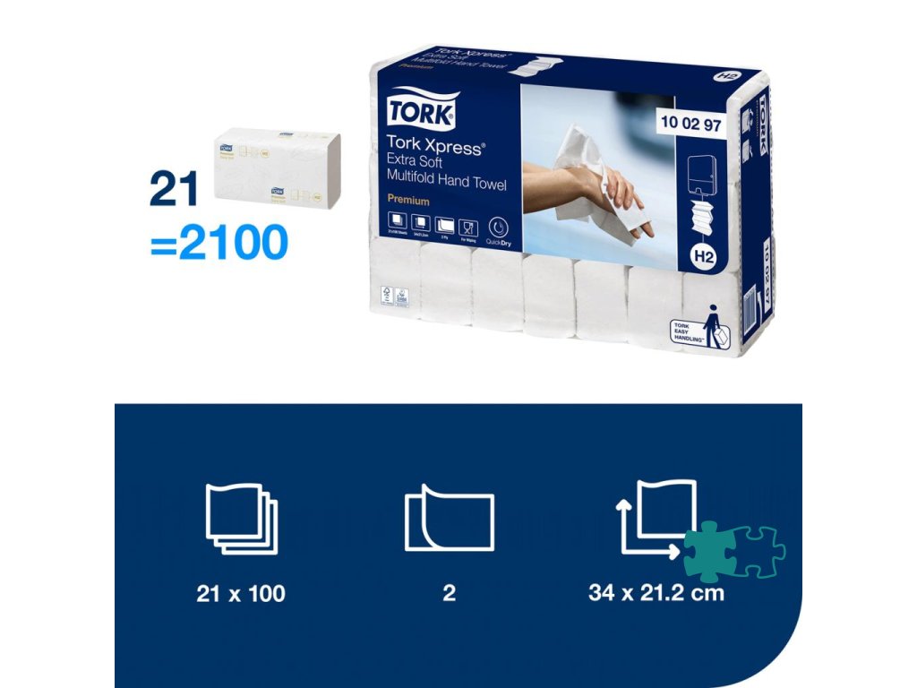 Doprajte si výnimočné sušenie rúk a pohodlie s veľkými a extra mäkkými Tork Xpress® jemnými papierovými utierkami na ruky Extra Soft Multifold Premium. Utierky sú vhodné do Tork Xpress® zásobníka systému H2 na papierové utierky Multifold v stredne frekventovaných toaletách a umyvárňach. Možno ho použiť do malých priestorov a vašim hosťom poskytuje pohodlie aj hygienu.Papierové uteráky extra jemné 2-vrstvové vyrobené z celulózy.