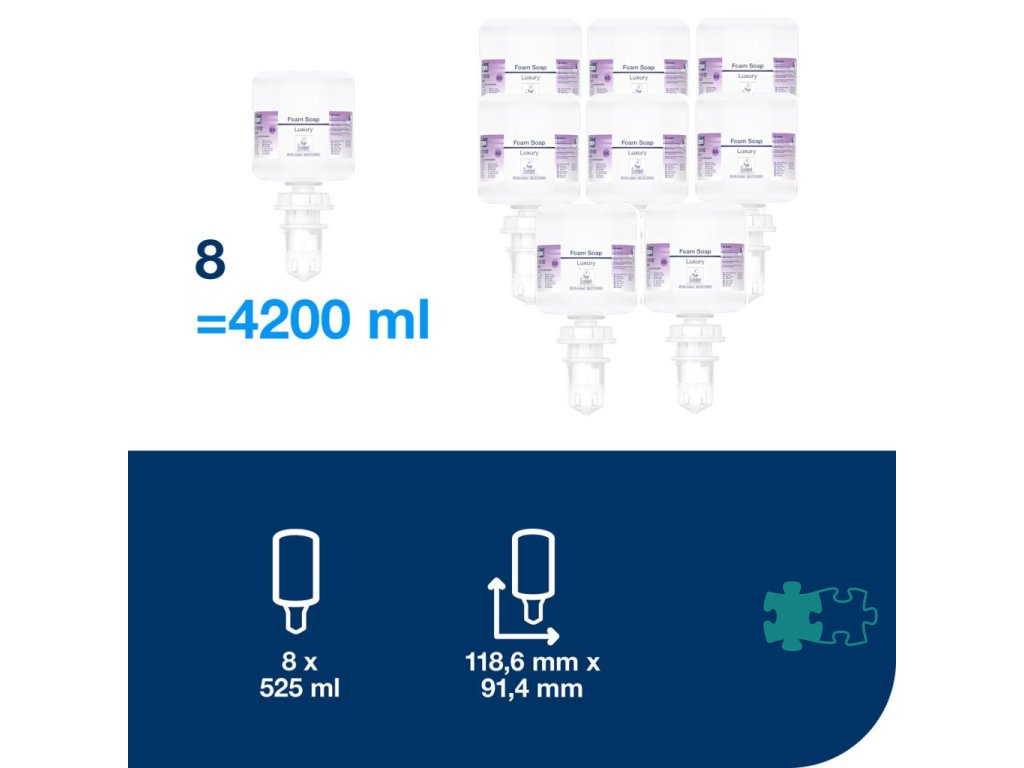 Rozmaznajte svojich návštevníkov dotykom luxusu vďaka Tork luxusnému penovému mydlu. Luxusne parfumované zloženie obohatené o prírodný výťažok z magnólie a hydratujúce zložky obnovujúce lipidy pre luxusný a krémový zážitok z umývania rúk. Vhodné pre Tork mini zásobníky na mydlá a dezinfekčné prostriedky, ktoré sú overené ako ľahko používateľné a všetkým používateľom poskytujú správnu hygienu rúk.objem: 525 ml
