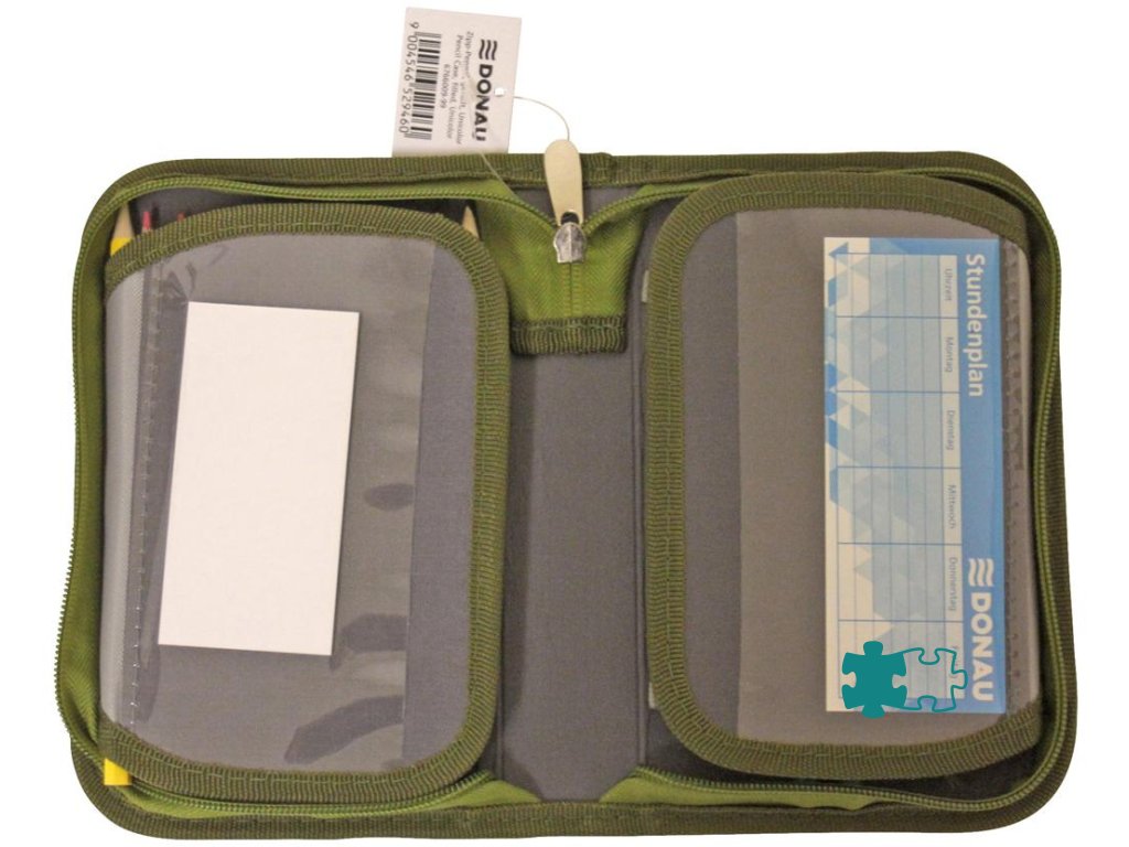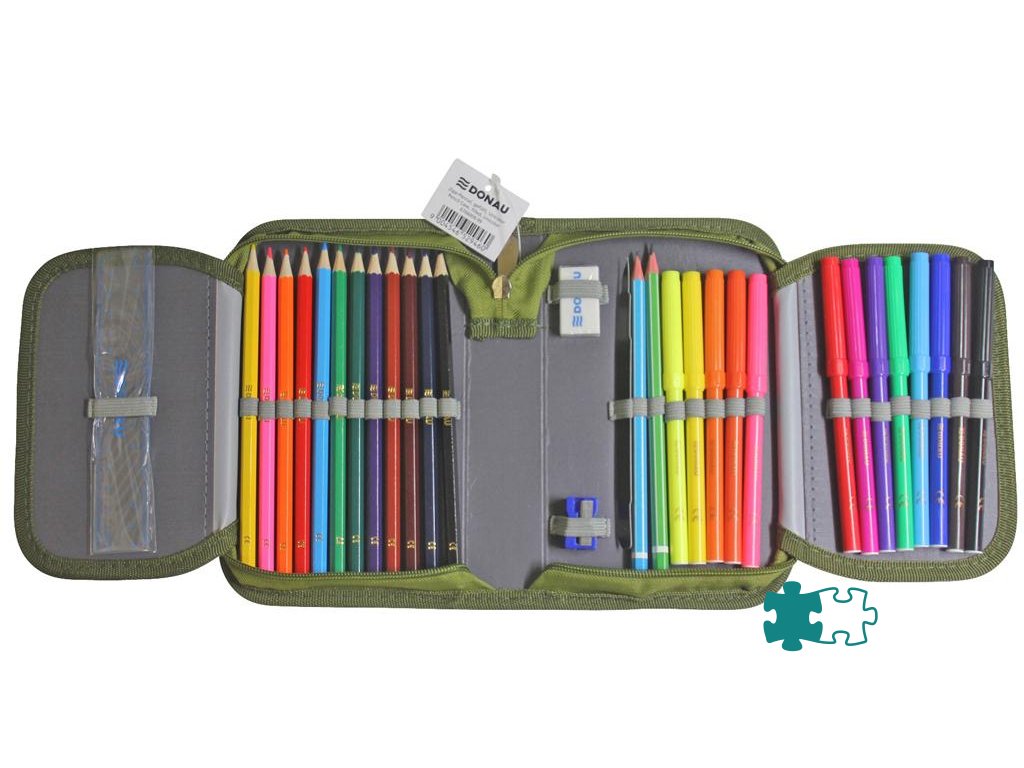 Plný 1-zipsový peračník, 2-chlopňový, 6 rôznych farieb (olivová, modro-červená, tyrkysová, zeleno-modrá, čierno-oranžová, sivo-ružová), 32 kusov (obsah: 1 rozvrh hodín, 1 poznámkový blok bez riadkov, 1 pravítko, 12 farebných ceruziek, 1 guma, 1 strúhadlo, 2 ceruzky, 13 fixiek), materiál polyester, ŠxVxH: 195x36x130mm, hmotnosť 330g.Dodatočné parametre