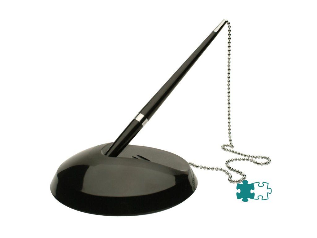 Plastové pero na stojane s prilepovacou základňou, spojené 58 cm retiazkou. Dodávané s čiernou náplňou a 2 náhradnými náplňami. Farba čierna. Rozmer tuhy 10,7cmDodatočné parametre