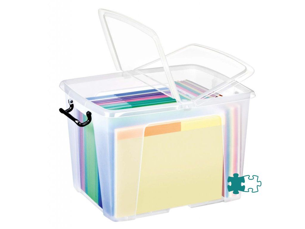 Transparentný robustný multifunkčný box z plastu s vekom, stohovateľný pri nepoužívaní. Motýlie veko na otváranie z 2 strán z dôvodu ľahšieho prístupu, 2 pevné rukoväte slúžiace na prenos boxu a súčasne ako klip na pevné uzatvorenie boxu. Materiál recyklovaný PP. Objem 40 litrov, romery 50 × 39,5 × 32 cm (dĺžka, šírka, výška). Na tento produkt platí predĺžená záruka 5 rokov.Dodatočné parametre