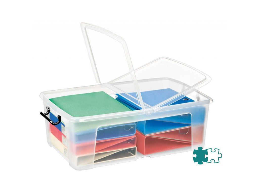 Transparentný robustný multifunkčný box z plastu s vekom, stohovateľný pri nepoužívaní. Motýlie veko na otváranie z 2 strán z dôvodu ľahšieho prístupu, 2 pevné rukoväte slúžiace na prenos boxu a súčasne ako klip na pevné uzatvorenie boxu. Materiál recyklovaný PP. Objem 50 litrov, romery 70 × 45 × 24,1 cm (dĺžka, šírka, výška). Na tento produkt platí predĺžená záruka 5 rokov.Dodatočné parametre