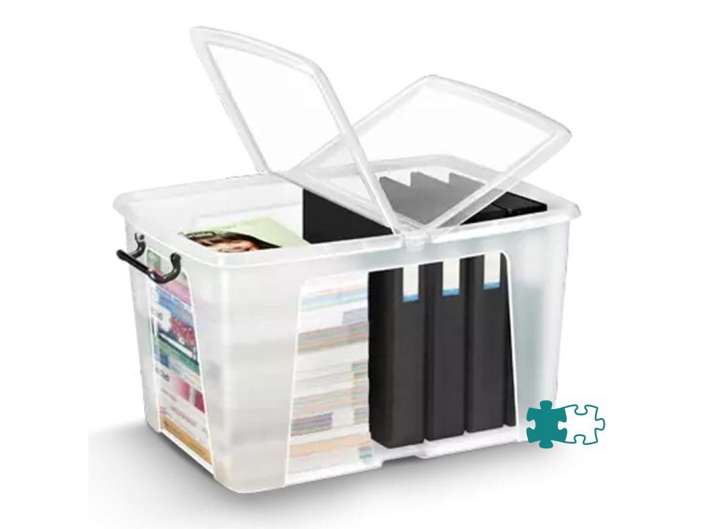 Transparentný robustný multifunkčný box z plastu s vekom, stohovateľný pri nepoužívaní. Motýlie veko na otváranie z 2 strán z dôvodu ľahšieho prístupu, 2 pevné rukoväte slúžiace na prenos boxu a súčasne ako klip na pevné uzatvorenie boxu. Materiál recyklovaný PP. Objem 65 litrov, romery 59 × 45 × 35 cm (dĺžka, šírka, výška). Na tento produkt platí predĺžená záruka 5 rokov.Dodatočné parametre