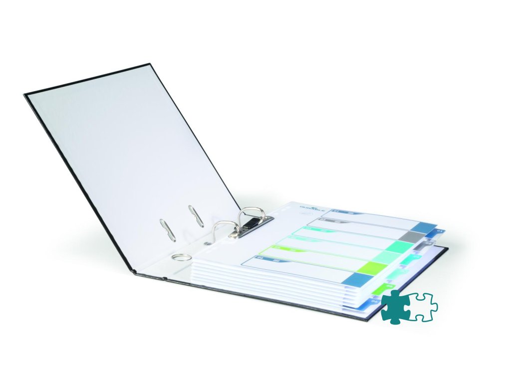 Opakovane použiteľný a extra široký priehľadný plastový rozraďovač, potlačiteľný. Možnosť potlače, vysoká odolnosť proti roztrhnutiu. Odolný polypropylén. Univerzálne dierovanie pre všetky pákové zakladače a krúžkové viazače.Dodatočné parametre