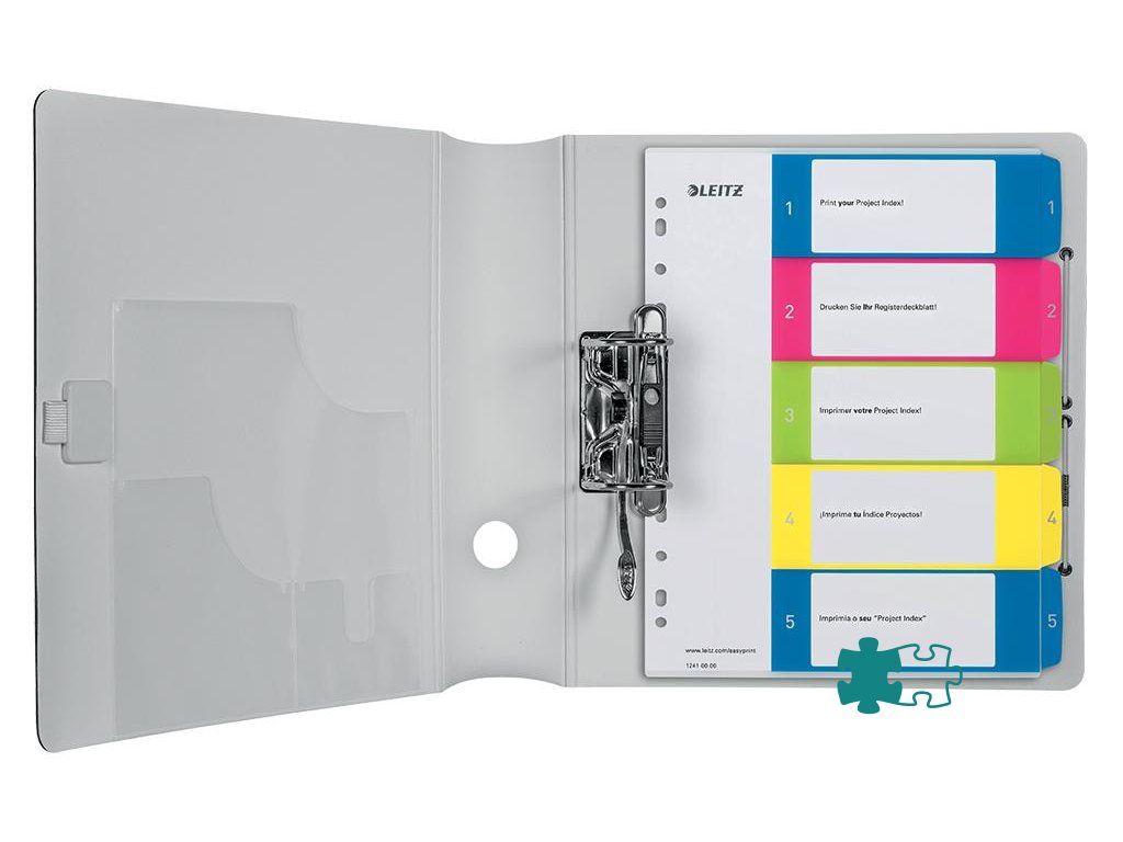 Opakovane použiteľný a extra odolný plastový číselný rozraďovač 1 - 5 v žiarivých farebných kombináciách s univerzálnou perforáciou. Materiál odolný polypropylén hrúbky 0,3 mm. Formát A4 maxi. Možnosť potlače na upravenie podľa vlastných potrieb, predloha stiahnuteľná zdarma na www.esselte.com/ easyprint.Dodatočné parametre