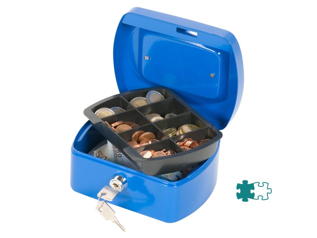 Uzamykateľná pokladnička s tvarovaným úchytom, plastovou priehradkou na mince a 2 kľúčami. Materiál pevná oceľ. Rozmery 155 × 75 × 120 mm. Farba modrá.Dodatočné parametre