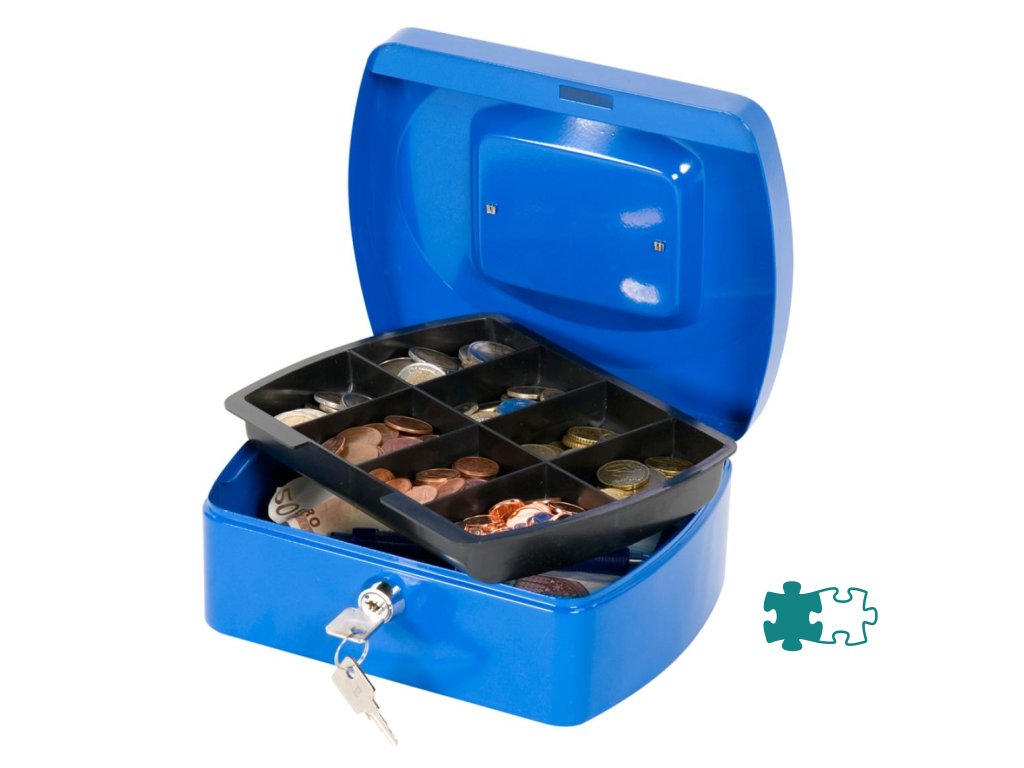 Uzamykateľná pokladnička s tvarovaným úchytom, plastovou priehradkou na mince a 2 kľúčami. Materiál pevná oceľ. Rozmery 205 × 85 × 160 mm. Farba modrá.Dodatočné parametre
