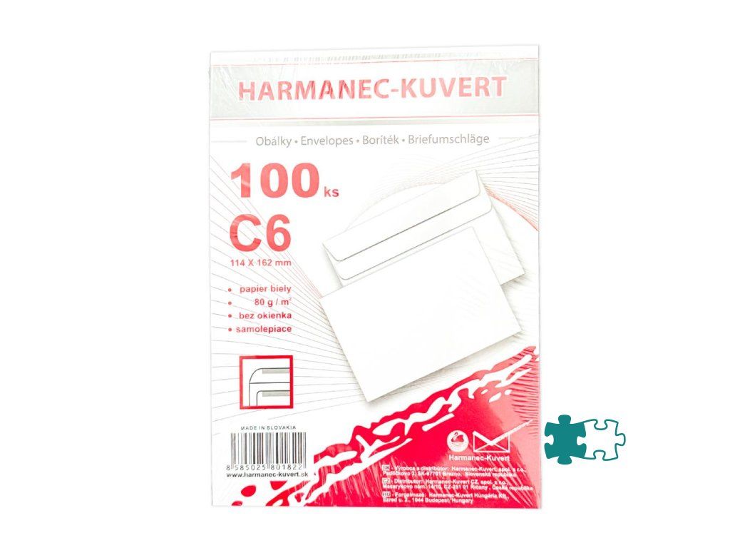 Biele obálky rozmeru 114 × 162 mm, vyrobené z bezdrevného papiera, 80 g/ m2. Samolepiace.Formát: C6