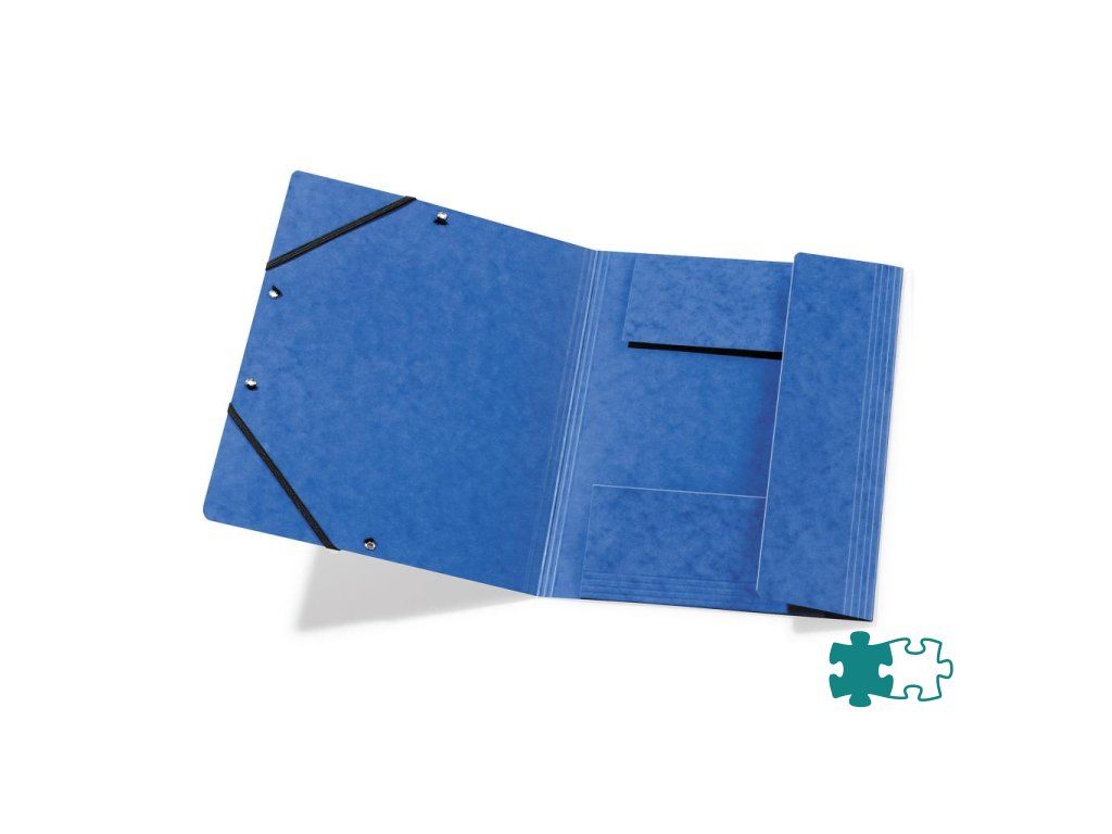 Obal A4 s tromi chlopňami a dvomi gumičkami čiernej farby. Materiál prešpánový kartón gramáže 355 g / m². Väčšie balenie 25 ks. Farba modrá.Dodatočné parametre