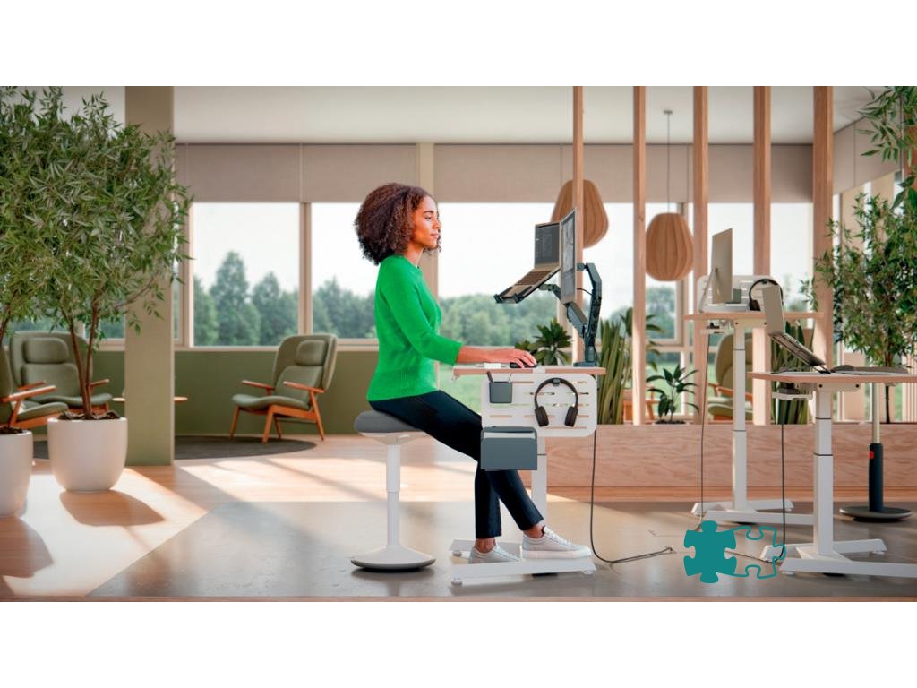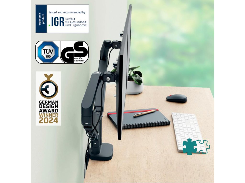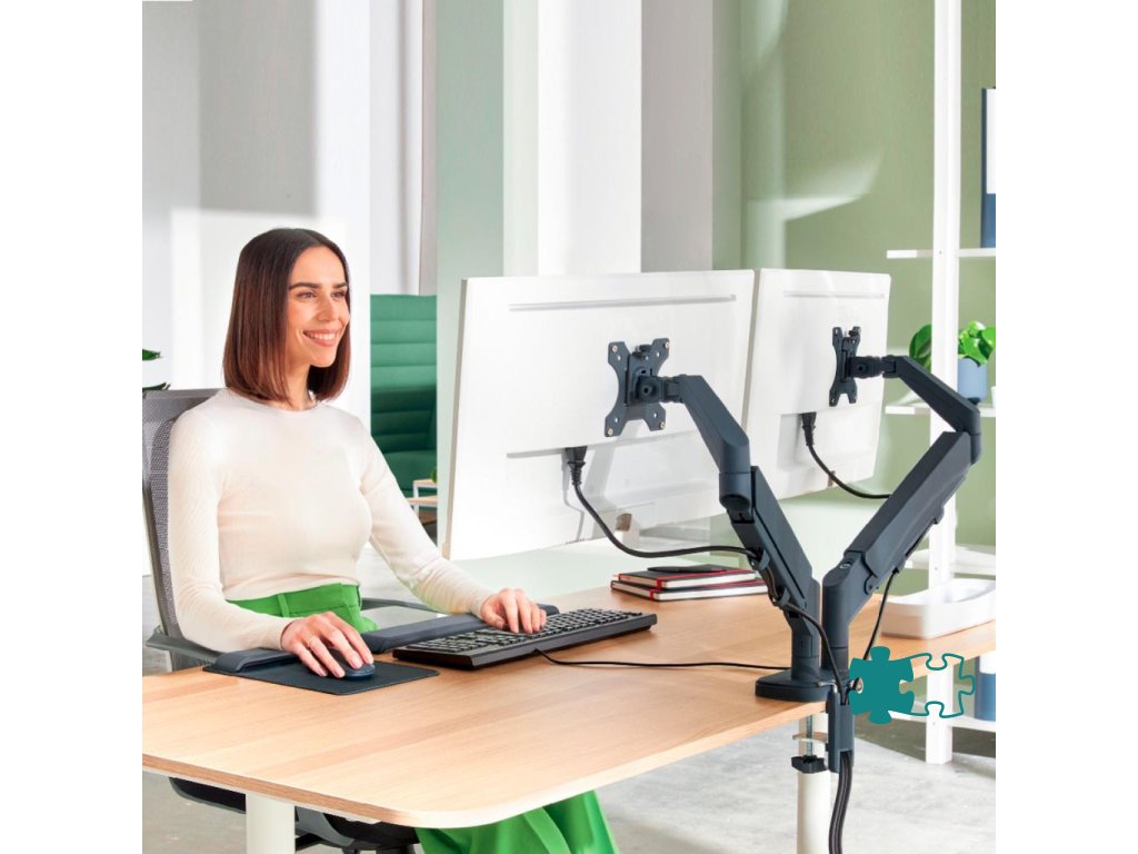 Súprava dvoch ramien na monitor a držiaka na notebook. Podpora obľúbenej aplikácie pre domácu kanceláriu: použitie obrazovky notebooku ako druhého monitora. Bezpečne držia notebooky do veľkosti 17 palcov a hrúbky 2,4 cm. Nezakrýva USB a ďalšie sloty.Zjednodušené nastavenie výšky zásten (185 mm - 435 mm) vďaka pružine