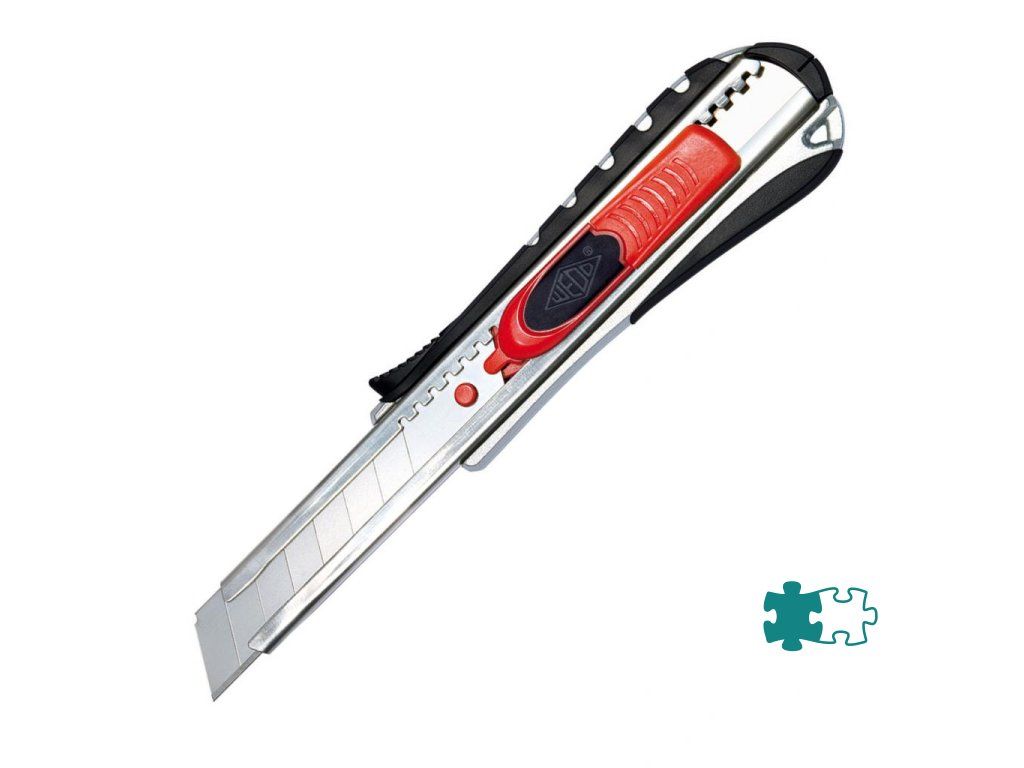 Kovové rezače s gumenou zónou, integrovaným odlamovačom čepele s funkciami štandardného a bezpečnostného rezača. Po ukončení rezu alebo v prípade, keď sa ostrie kĺže po rezanom materiáli, sa čepeľ automaticky zasunie. Čepeľ možno vysúvať aj pomocou integrovaného bežca. Šírka čepele 18 mm. Schválené inštitútom TÜV. Farba červená/ čierna.Dodatočné parametre
