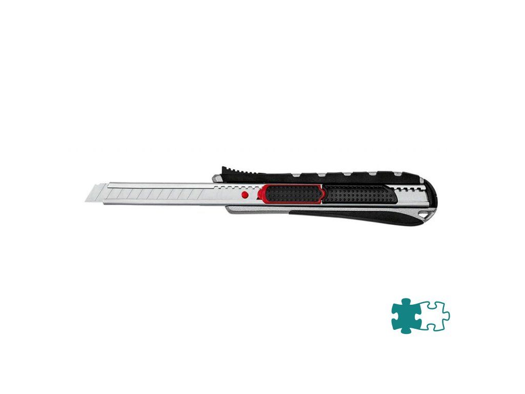 Kovové rezače s gumenou zónou, integrovaným odlamovačom čepele s funkciami štandardného a bezpečnostného rezača. Po ukončení rezu alebo v prípade, keď sa ostrie kĺže po rezanom materiáli, sa čepeľ automaticky zasunie. Čepeľ možno vysúvať aj pomocou integrovaného bežca. Šírka čepele 9 mm. Schválené inštitútom TÜV. Farba červená/ čierna.Dodatočné parametre
