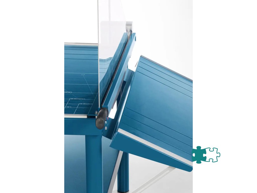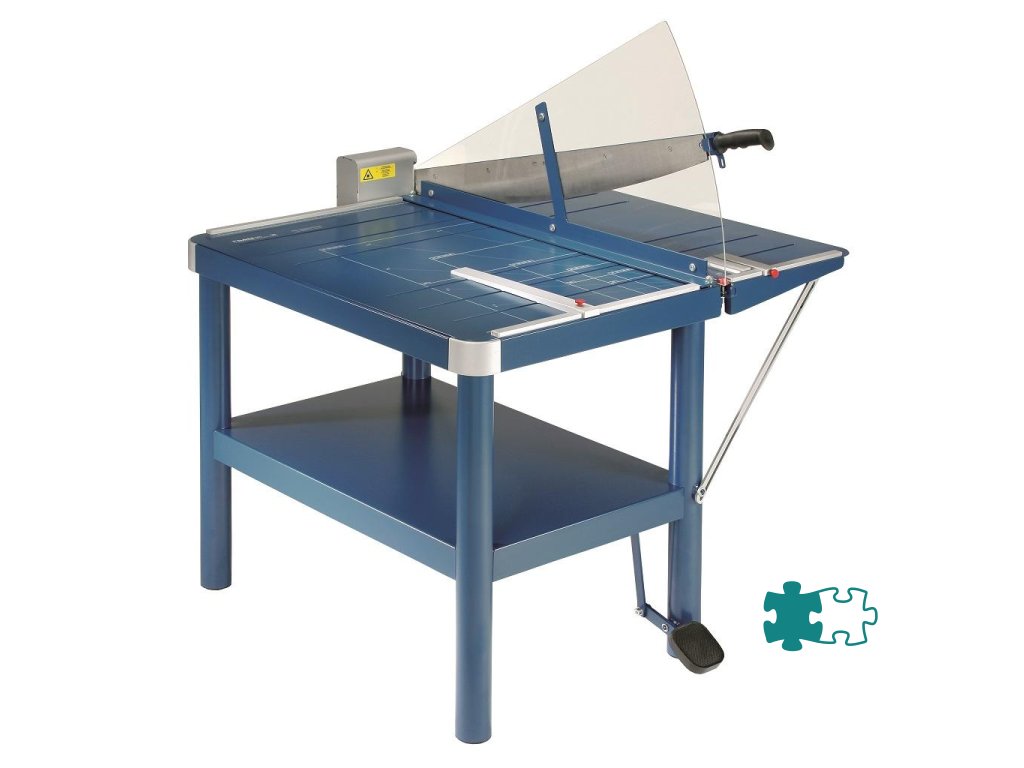 Veľká kovová robustná páková rezačka s vlastným stojanom a uzamykateľným nožom. Brúsený vrchný a spodný nôž z kvalitnej nožiarskej ocele Solingen, rozkladateľný bočný stôl, nožný pedál na zabezpečenie prítlaku rezaného papiera, priehľadný ochranný kryt ostria z plexiskla, 2 bočné dorazy, zadný doraz. Predný doraz, fixovateľný ručnou pákou, vysúvateľný do 275 mm. Mierka v cm/ inch, DIN formáty.K rezačke je možné objednať zariadenie na rezanie tenkých prúžkov a zariadenie umožňujúce vytvoriť laserový lúč, indikujúci reznú líniu.Dĺžka rezu: 815 mm