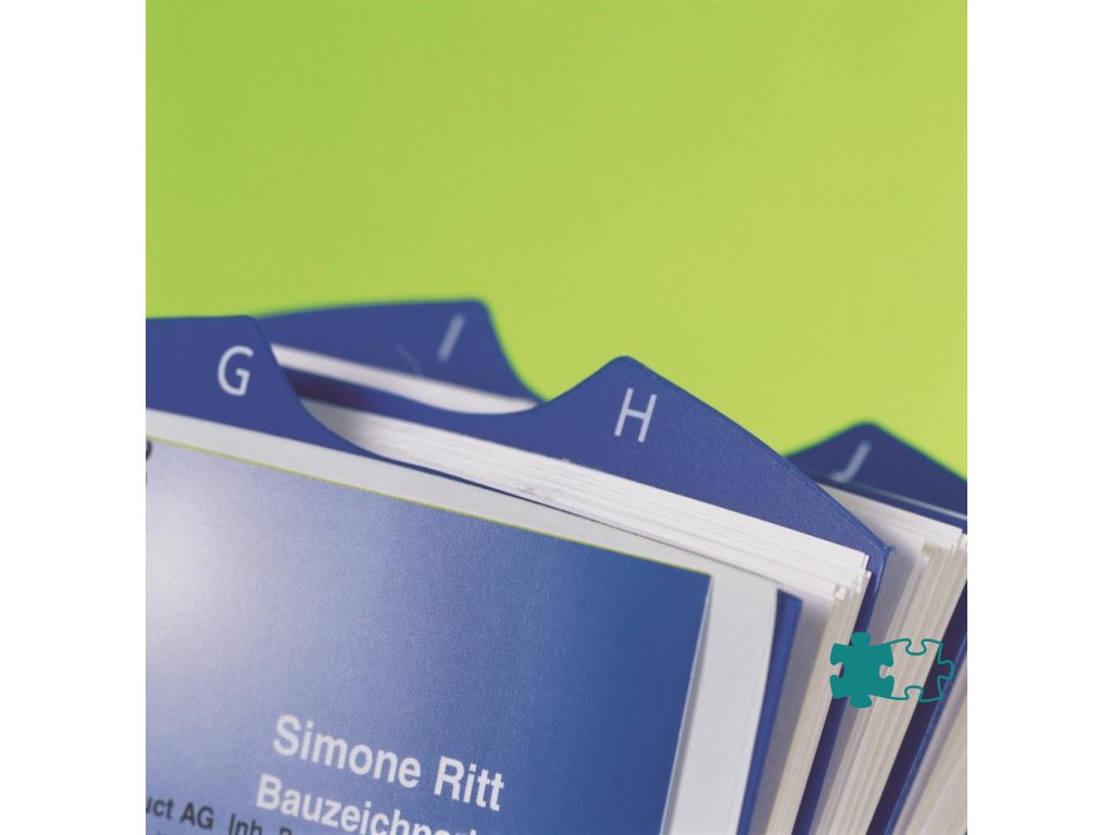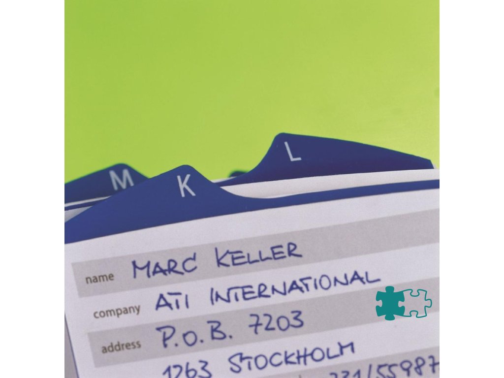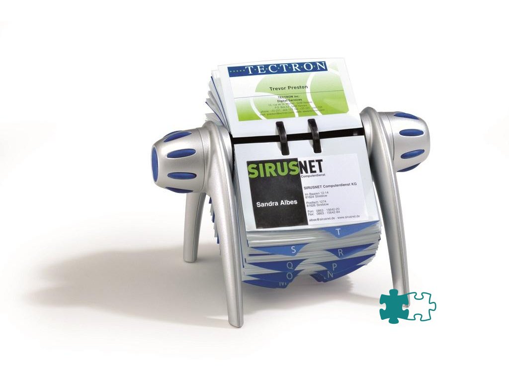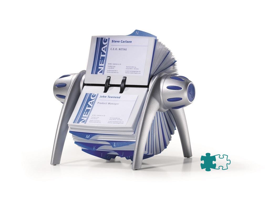 Rotačný vizitkár v exkluzívnom dizajne z plastu v kvalitnej povrchovej úprave. 200 obojstranných vreciek rozmeru 72 × 104 mm pre 400 vizitiek, abecedný rozraďovač s 25 oddielmi. Doplniteľný náhradnými vreckami Obj. kód DU241819.Farba: strieborná/modrá