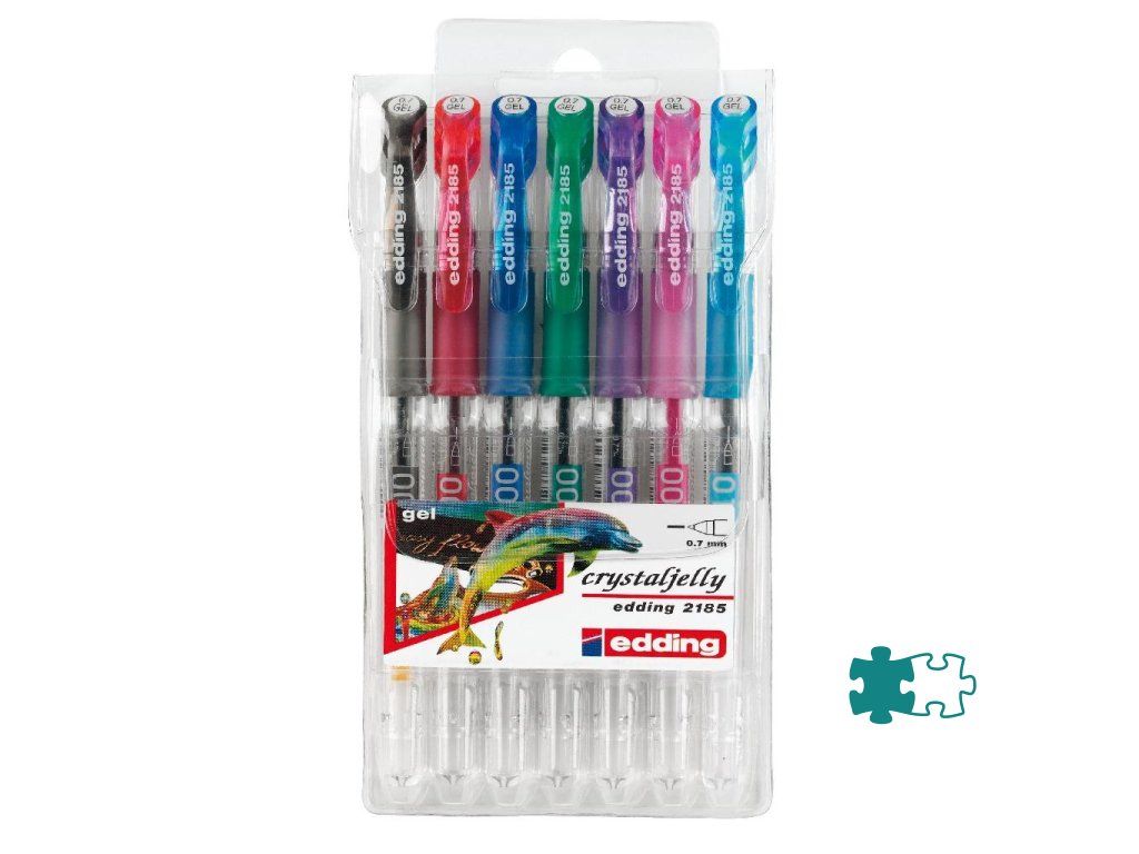 Jednorazový roller edding 2185 crystaljelly plnený špeciálnym gélom. Hrot pera uložený v akrylovej špičke umožňuje plynulé a súčasne veľmi presné písanie. Šírka stopy 0,7 mm. Sada 7 štandardných farieb.Dodatočné parametre