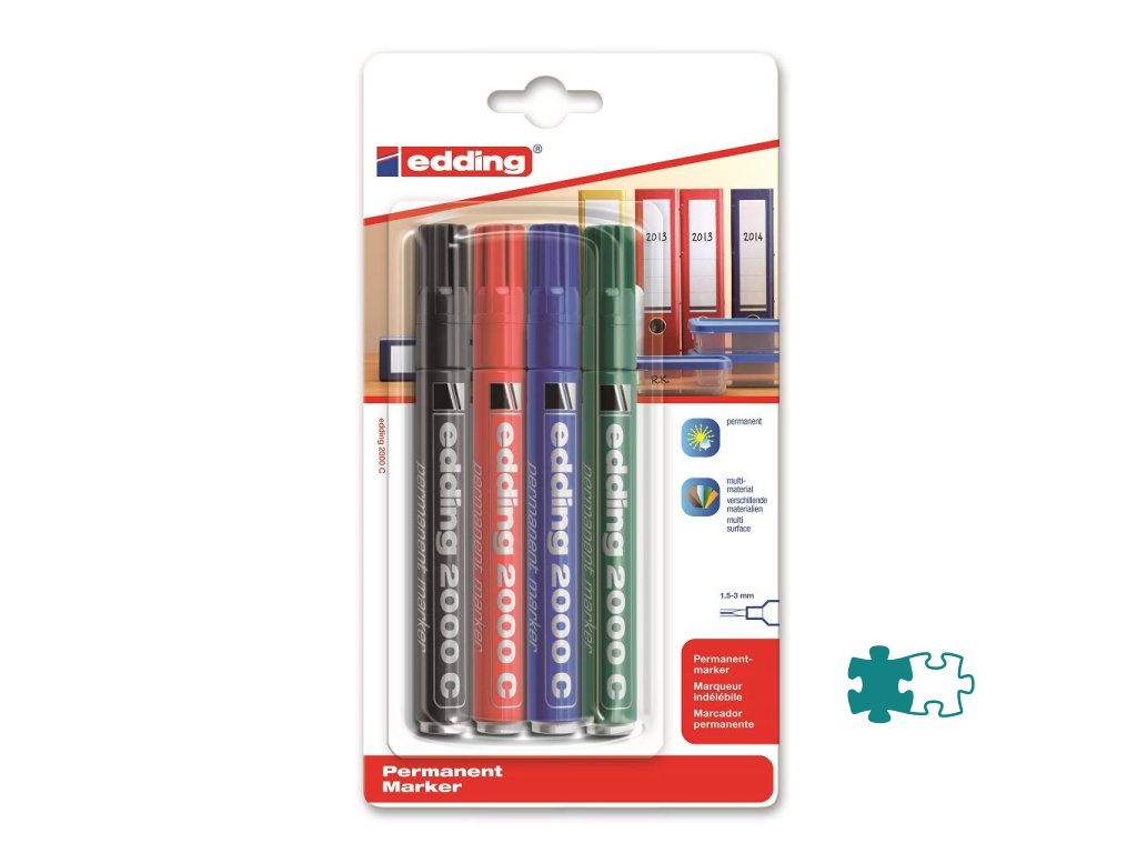 Sada 4 permanentných popisovačov na trvanlivé popisovanie, značenie, maľovanie a vyznačovanie takmer na všetky materiály vrátane kovu, skla a umelých hmôt. Hliníkový obal vo farbe popisovača, vymeniteľné špičky. Dopĺňateľné atramentom edding T 25 alebo MTK 25. Svetlostály, rýchloschnúci, nezmazateľný a vodeodolný atrament neobsahuje toluén/-xylén. Hrot okrúhly, šírka stopy 1,5-3 mm.Farba: sada 4 ks