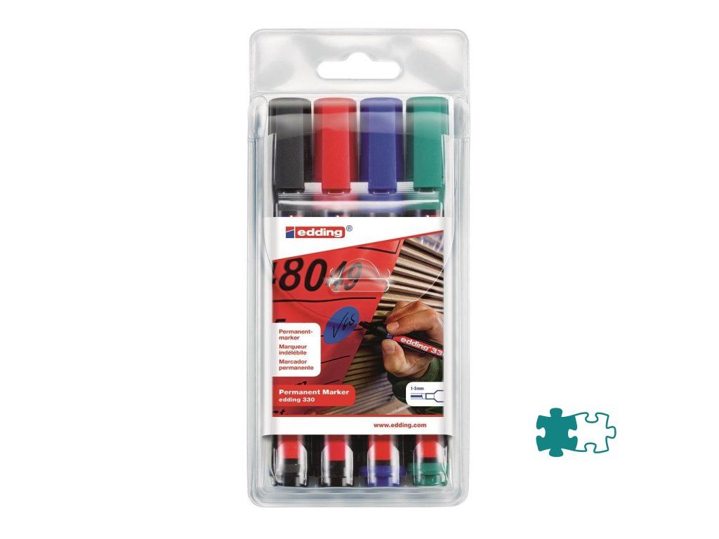 Permanentný popisovač vhodný na trvanlivé popisovanie, značenie, maľovanie a vyznačovanie takmer na všetky materiály vrátane kovu, skla a umelých hmôt. Plastový obal. Zrezaný hrot, šírka stopy 1,5 - 3 mm. Dopĺňateľný atramentom edding MTK 25 obj. kód ED250001 -4. Sada 4 ks v mixe farieb.Farba: sada 4 farieb