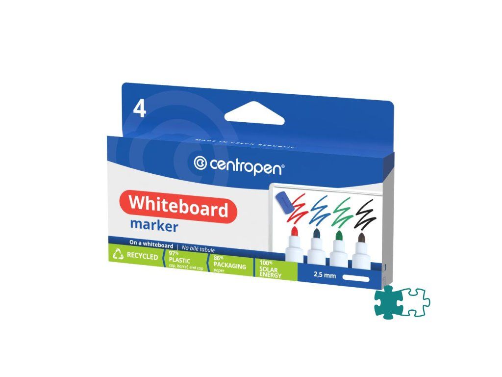 Za sucha stierateľný svetlostály popisovač. Vhodný na biele smaltované tabule, PVC, sklo, porcelán. Okrúhly hrot hrúbky 5 mm. Šírka stopy 2,5 mm. Sada 4 ks.Farba: mix 4 farieb