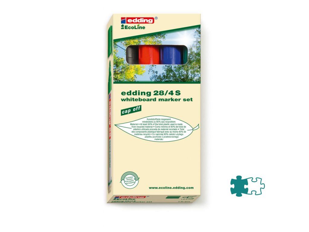Popisovač na biele tabule, za sucha stierateľný prakticky zo všetkých neporóznych povrchov, ako je keramická úprava, melamín i sklo. Minimálne 80 % plastovej časti je vyrobených z recyklovaného materiálu. Okrúhly hrot, šírka stopy 1,5 - 3 mm. Rýchloschnúci, vodeodolný, slabo zapáchajúci atrament intenzívnej farby. Krátky čas vydrží neuzavretý bez vyschnutia. Dodávaný v sade 4 ks.Farba: sada 4 farieb