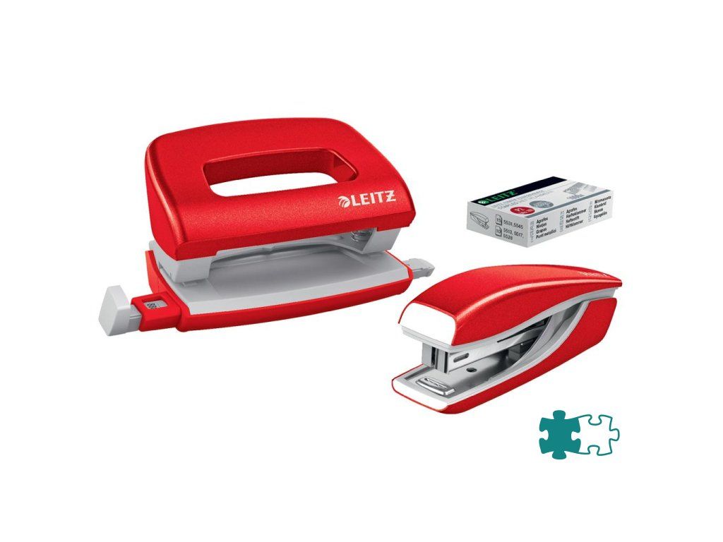 Minisúprava v moderných farbách. Malé a kompaktné rozmery. Kapacita 10 hárkov. Celokovová minizošívačka a dierovačka na použitie v kancelárii aj na cestách. Zošívačka s otvorením ramena o 180° na nástenkové zošívanie. Použite spinky Leitz Power Performance P2, č. 10, jedna škatuľka spiniek je súčasťou balenia. Dierovačka má príložník s kontrastnou potlačou jednotlivých formátov, rámček na jasné určenie formátu. Balenie v blistri. Farba červená.Dodatočné parametre