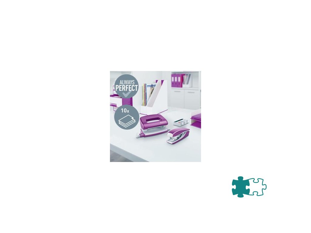 Minisúprava v moderných farbách. Malé a kompaktné rozmery. Kapacita 10 hárkov. Celokovová minizošívačka a dierovačka na použitie v kancelárii aj na cestách. Zošívačka s otvorením ramena o 180° na nástenkové zošívanie. Použite spinky Leitz Power Performance P2, č. 10, jedna škatuľka spiniek je súčasťou balenia. Dierovačka má príložník s kontrastnou potlačou jednotlivých formátov, rámček na jasné určenie formátu. Balenie v blistri. Farba purpurová.Dodatočné parametre