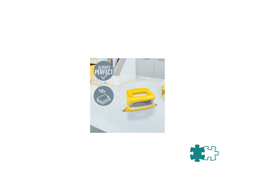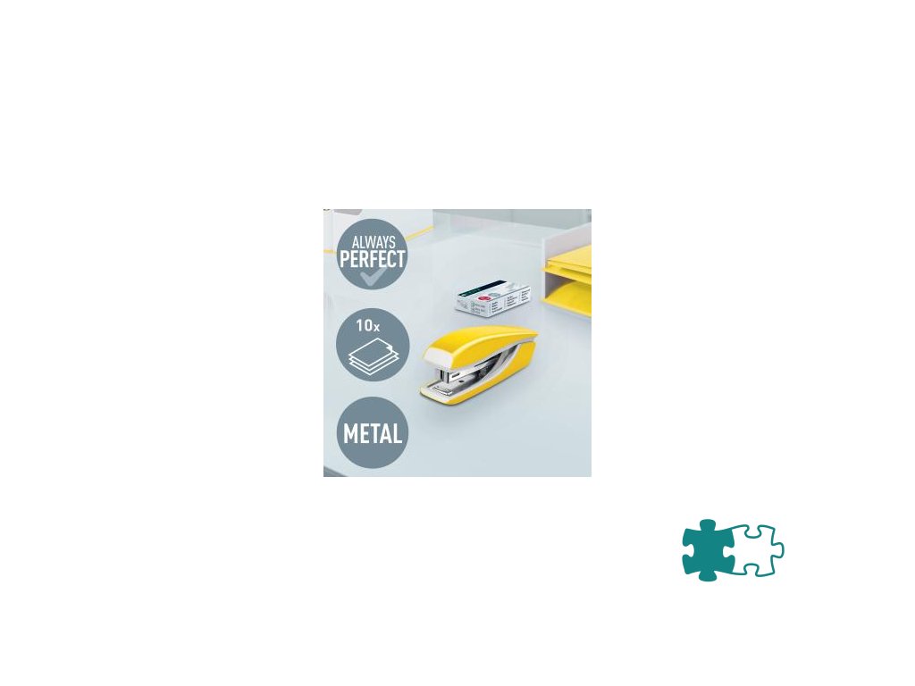Minisúprava v moderných farbách. Malé a kompaktné rozmery. Kapacita 10 hárkov. Celokovová minizošívačka a dierovačka na použitie v kancelárii aj na cestách. Zošívačka s otvorením ramena o 180° na nástenkové zošívanie. Použite spinky Leitz Power Performance P2, č. 10, jedna škatuľka spiniek je súčasťou balenia. Dierovačka má príložník s kontrastnou potlačou jednotlivých formátov, rámček na jasné určenie formátu. Balenie v blistri. Farba žltá.Dodatočné parametre