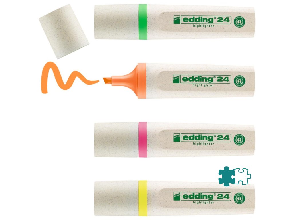 Minimálne 90% tela a uzáveru zvýrazňovača je vyrobené z obnoviteľných zdrojov. Zvýrazňovač so zrezaným hrotom so šírkou stopy 2 - 5 mm. Pre zvýraznenie textových pasáží, poznámok a pod. Atrament na vodnej báze s intenzívnymi farbami. Dopĺňateľný atramentom HTK 25.Sada 4 farieb