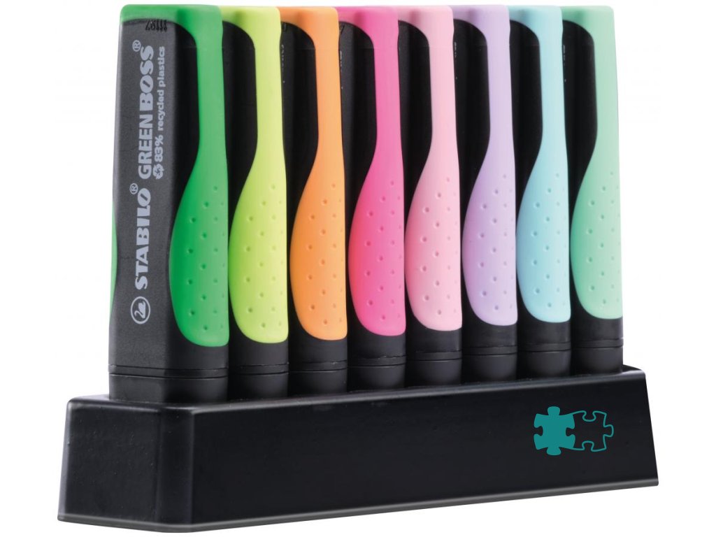 STABILO GREEN BOSS je zvýrazňovač vyrobený z 83% recyklovaného plastu pre školákov, študentov, učiteľov a kancelárskych pracovníkov, ktorí sú ohľaduplní k životnému prostrediu. Ekologický zvýrazňovač je k dispozícii v trendových pastelových a svetlých farbách! Technológia STABILO Anti-Dry-Out chráni pred vysychaním po dobu 4 hodín a zaisťuje koncentrovanú prácu. Značkuje a podčiarkuje v dvoch šírkach stopy 2 a 5 mm. Vďaka protišmykovej zóne úchopu leží bezpečne v ruke. Balenie sada 4 kusy. Väčšie balenie 5 sád.- Zvýrazňovač vyrobený z 83 percent z recyklovaného plastu
