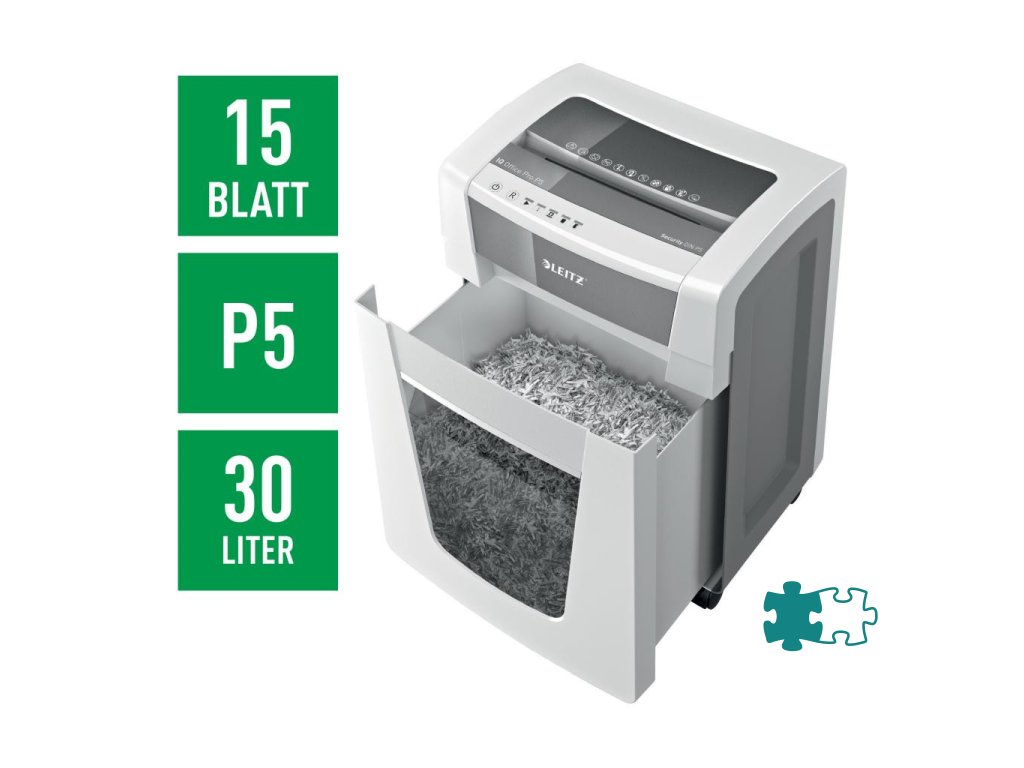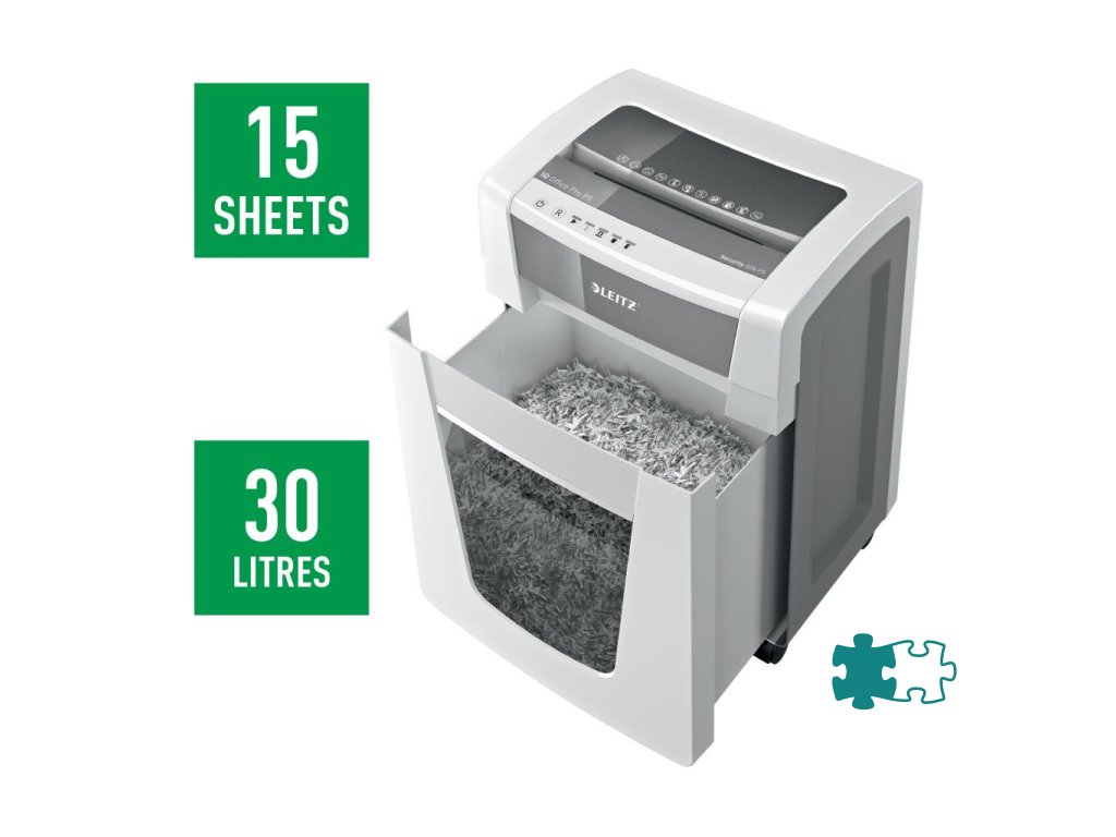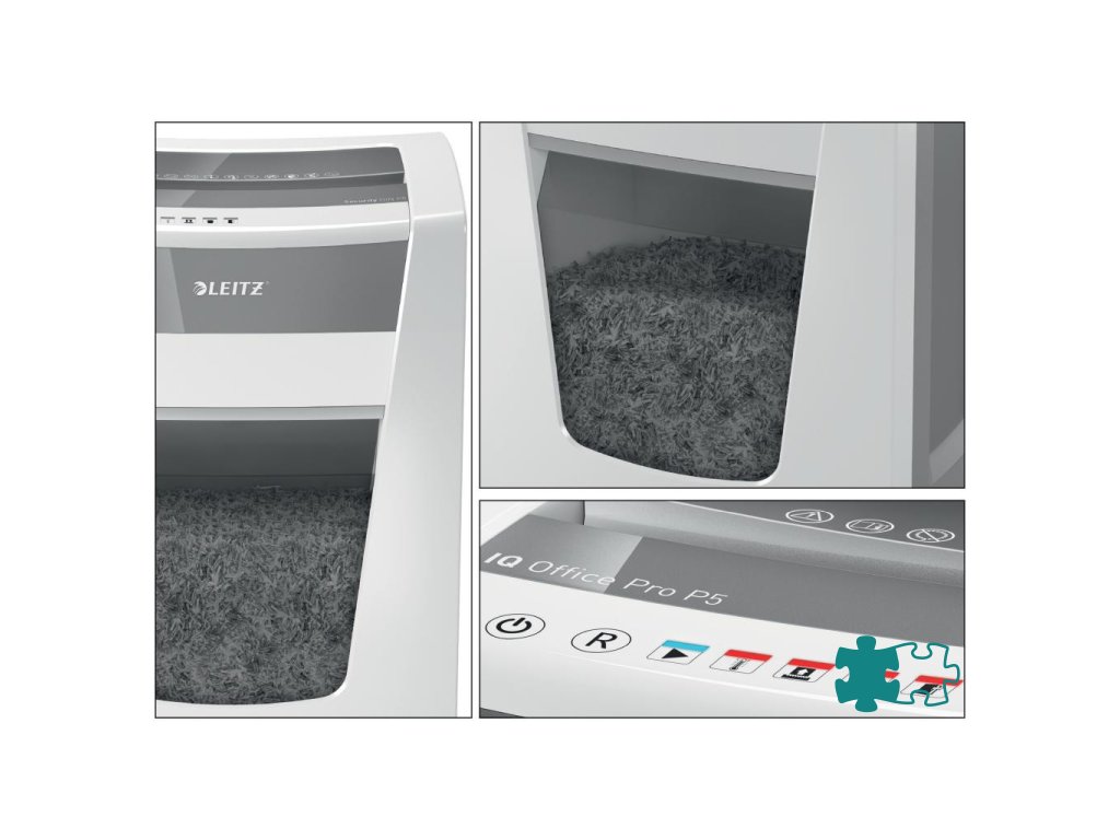Nový skartovač Leitz IQ Office Pro ponúka moderný štýlový vzhľad, vysokú výkonnosť a bezpečnosť. Stupeň utajenia DIN P5 pre vysoké zabezpečenie skartovaných dokumentov. Perfektné bezproblémové skartovanie, ideálne na použitie vo veľkých kanceláriách. Excelentný výkon s technológiou proti zaseknutiu papiera, tichý chod a dlhý čas, po ktorý je skartovač schopný skartovať. Skartuje až 15 hárkov A4 na malé mikročasti a do veľkého koša s objemom 30 l. Jednoduché ovládanie pomocou dotykových ovládacích prvkov. Dlhý skartovací cyklus pre až 4 hodiny dlhé neprerušované skartovanie.