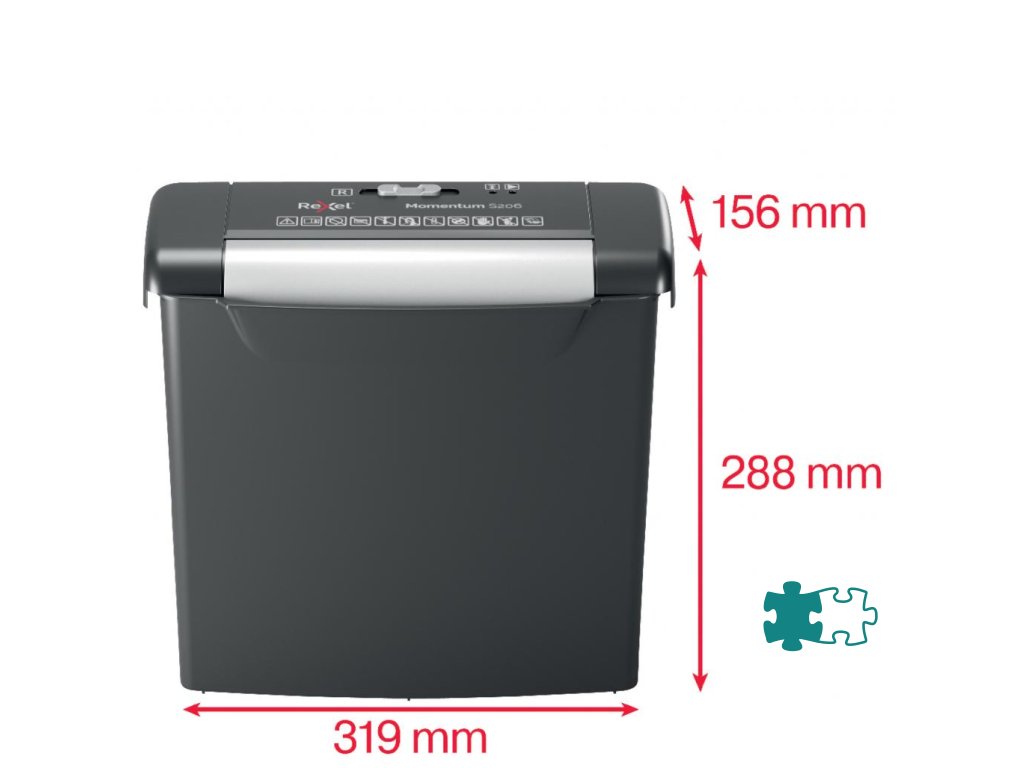 Nezastaviteľná skartovačka! Rexel Momentum S206 skartuje až 6 hárkov naraz a vydrží v nepretržitom chode 2 minúty, vhodná na použitie doma. Prúžkový rez na úrovni zabezpečenia P2 reže papier na prúžky so šírkou 6 mm. Odpadový kôš s kapacitou 9 l pojme 75 hárkov A4.