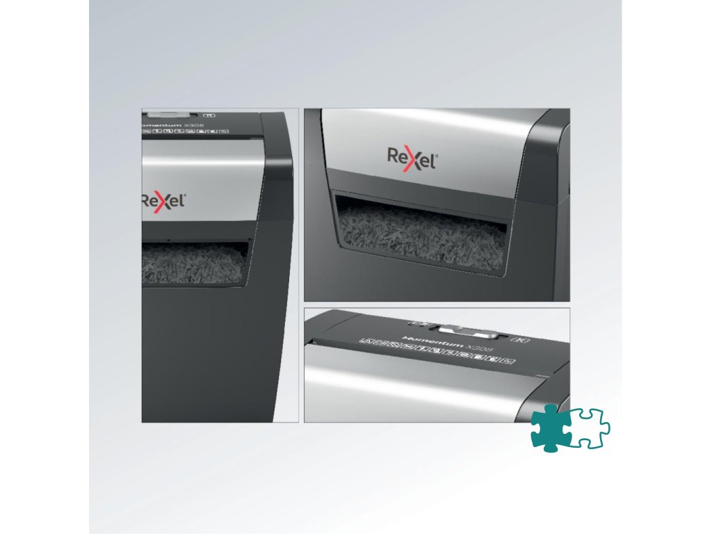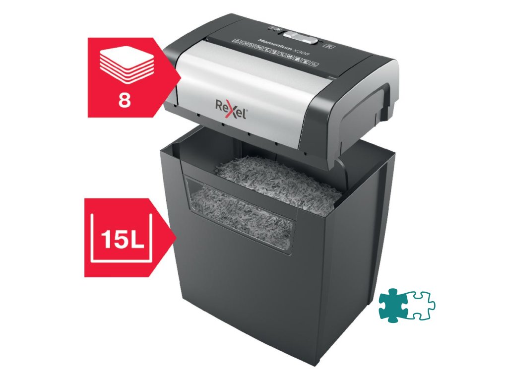 Nezastaviteľná skartovačka! Rexel Momentum X308 skartuje až 8 hárkov naraz a vydrží v nepretržitom chode 3 minúty, vhodná na použitie doma. Krížový rez na úrovni zabezpečenia P3 reže papier na časti s veľkosťou 5 × 42 mm. Odpadový kôš s kapacitou 15 l pojme 100 hárkov A4.