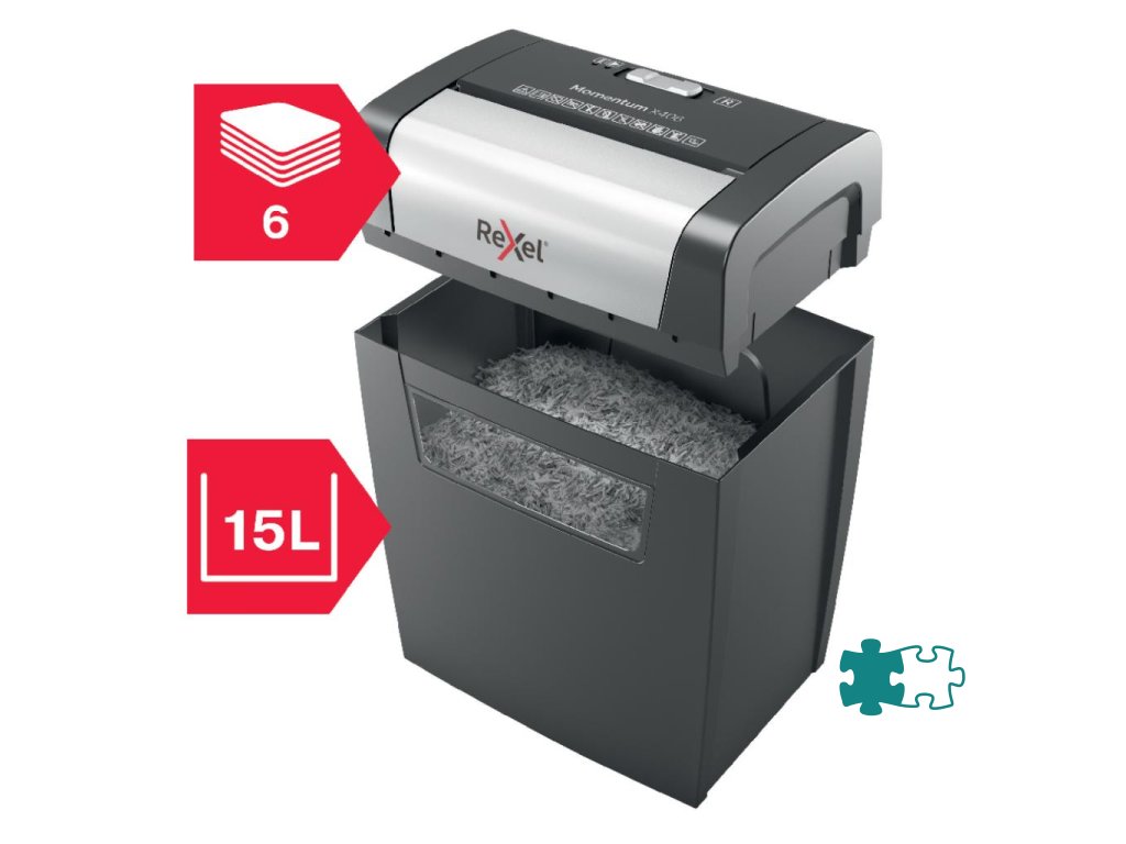 Nezastaviteľná skartovačka! Rexel Momentum X406 skartuje až 6 hárkov naraz a vydrží v nepretržitom chode 3 minúty, vhodná na použitie doma. Krížový rez na úrovni zabezpečenia P4 reže papier na malé časti s veľkosťou 4 × 28 mm. Odpadový kôš s kapacitou 15 l pojme 125 hárkov A4.