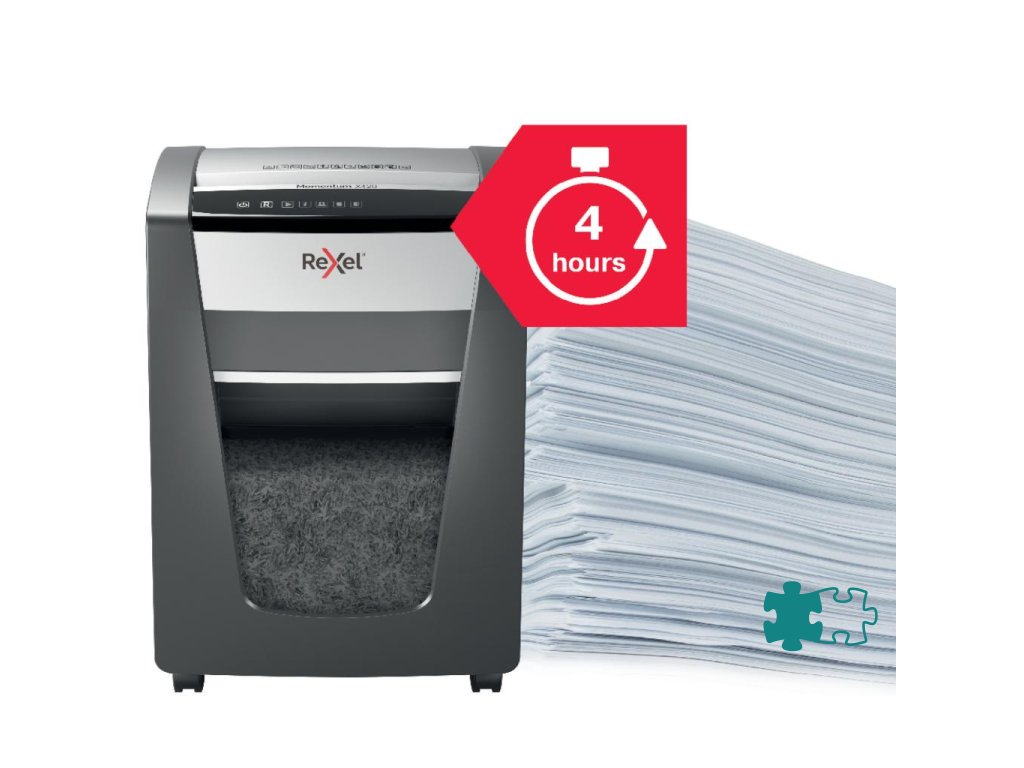 Nezastaviteľná skartovačka! Rexel Momentum X420 skartuje až 20 hárkov naraz a vydrží v nepretržitom chode 4 hodiny, vhodný na použitie v menších kanceláriách. Technológia proti zaseknutiu papiera garantuje neprerušované skartovanie. Krížový rez na úrovni zabezpečenia P4 reže papier na časti s veľkosťou 4 × 40 mm. Dotykové ovládanie pre jednoduché a intuitívne ovládanie. Objemný kôš s kapacitou 30 l pojme 275 hárkov A4.