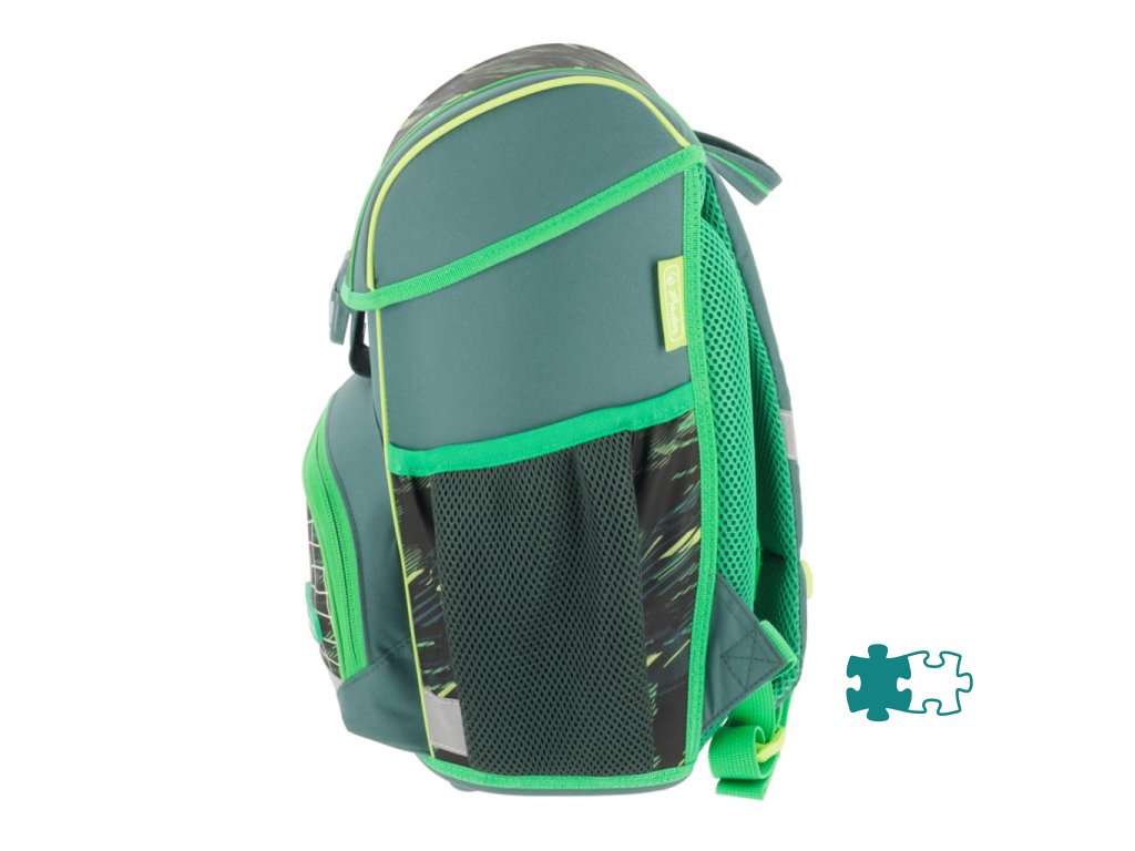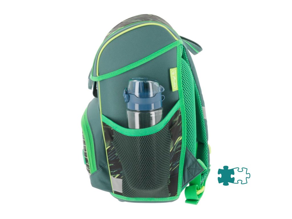 Školská taška s výbavou, ergonomicky tvarovaným a priedušným polstrovaním chrbta, nastaviteľnými ramennými popruhmi, výškovo nastaviteľným hrudným pásom, hlavným vreckom s priestorom na knihy, bočnými vreckami s elastickými pásikmi, predným vreckom na zips, stabilnou spodnou doskou s nožičkami, pohodlnou rukoväťou a reflexnými prvkami Oralite. Hmotnosť 950 g, objem 16 l, rozmery 37 x 31 x 22 cm. Vode-odolná, bez PVC, výbava: peračník, vrecko na prezuvky, okrúhle puzdro. Certifikát ergonómie 2023 a 2025. Materiál: Polyester.Dodatočné parametre