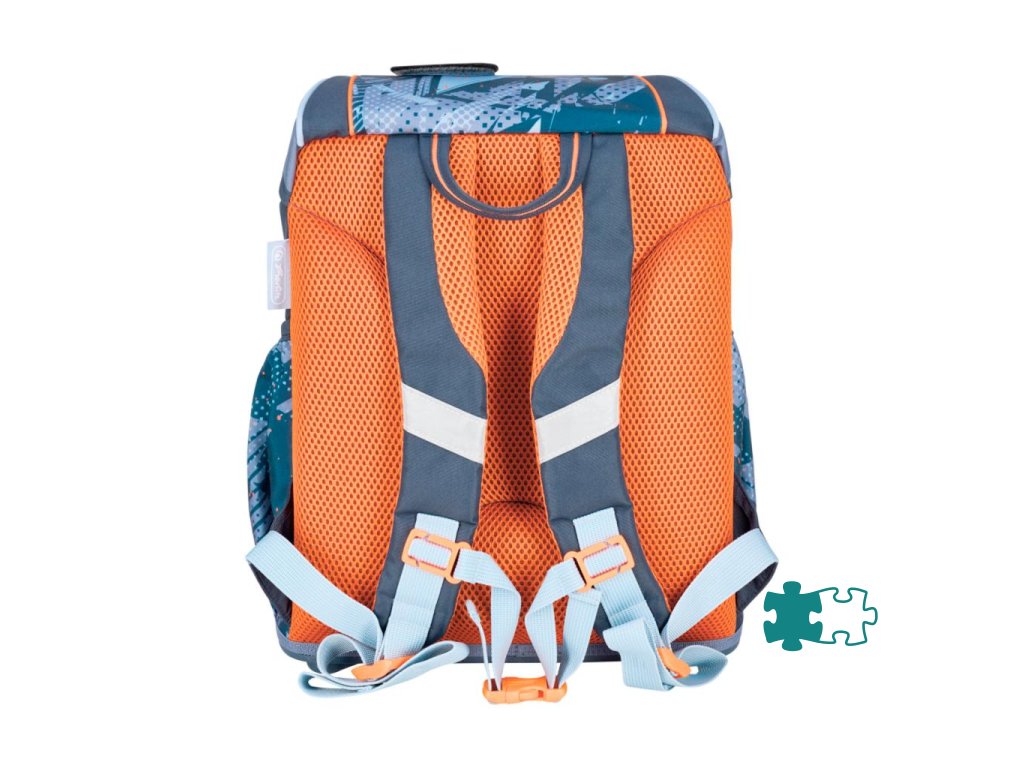 Školská taška bez výbavy, s anatomicky tvarovaným polstrovaným chrbtom, širokými nastaviteľnými ramennými popruhmi, hrudným popruhom, predným vreckom, dvomi bočnými vreckami, reflexnými prvkami Oralite, 1x aplikácia na suchý zips, 1 x dekoratívny prvok. Hmotnosť 750 g, objem 15 l, rozmery: 36 x 28 x 21 cm.Dodatočné parametre