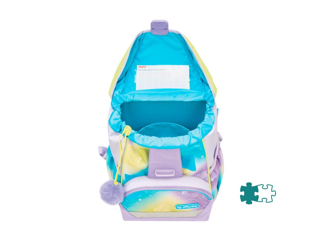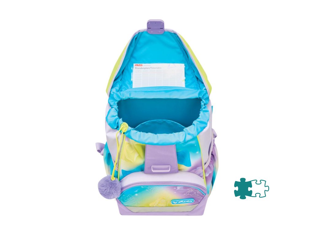 Školská taška s výbavou, s anatomicky tvarovaným polstrovaným a priedušným chrbtom, nastaviteľnými ramennými popruhmi, predným vreckom na zips, dvomi bočnými vreckami s elastickými pásikmi, stabilnou spodná doskou s nožičkami, pohodlnou rukoväťou, reflexnými prvkami Oralite, zatváranie Click lock zips, 1 x odnímateľný odznačik na suchý zips, 1 x dekoratívny prvok. Hmotnosť 800 g, objem 22 l, rozmery: 39 x 32 x 25 cm. Vode-odolná, bez PVC, výbava: peračník prázdny 2 chlopne, vrecko na prezuvky, oválne puzdro.Dodatočné parametre