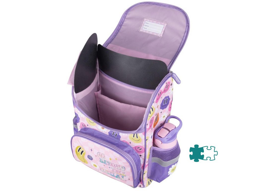 Extrémne ľahká školská taška prispôsobená veku a hmotnosti dieťaťa, čo znamená, že dodatočne nezaťažuje chrbticu a kĺby. Vhodná pre žiakov 1. - 2. ročníka ZŠ. Profilovaná a vystužená konštrukcia pomáha udržiavať správne držanie tela. Vstavané ventilačné kanáliky zaisťujú dostatočné prúdenie vzduchu, takže batoh neprehrieva chrbát dieťaťa. Široké a mäkké popruhy s nastaviteľnou dĺžkou zvyšujú komfort, nezaťažujú ramená a umožňujú prispôsobenie školskej tašky výške dieťaťa. S hrudným popruhom spájajúcim ramenné popruhy, ktorý zabraňuje skĺznutiu z pliec a odľahčuje chrbát. Dodatočný stabilizačný panel chrániaci bedrovú časť. Pogumovaná rukoväť a uzamykacie gombíky umožňujú ľahké a pohodlné držanie. Vybavená funkčnou hlavnou priehradkou s dodatočnou priehradkou, ktorá uľahčuje organizáciu a rýchly prístup k potrebným veciam. Má ďalšie vonkajšie vrecko na zips a dve bočné, elastické vonkajšie vrecká na nápoje alebo iné drobnosti. Rozmery: 38 x 28 x 18 cm. Vzor: úsmev.Dodatočné parametre