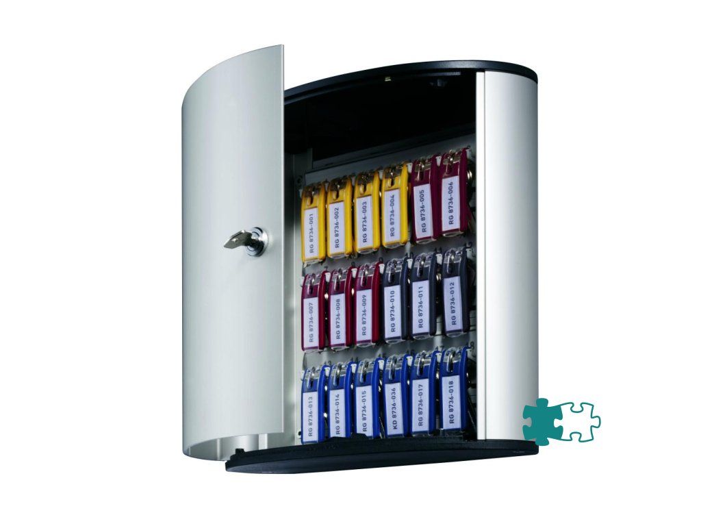 Skrinka na 18 kľúčov s dvierkami, otvárajúcimi sa z dôvodu lepšej obsluhy v 180° uhle. Jednoduchá montáž na stenu. Súčasťou balenia je montážna sada, 2 bezpečnostné kľúče a 6 menoviek na kľúče v rôznych farbách. Farba strieborná.Výška: 28 cm