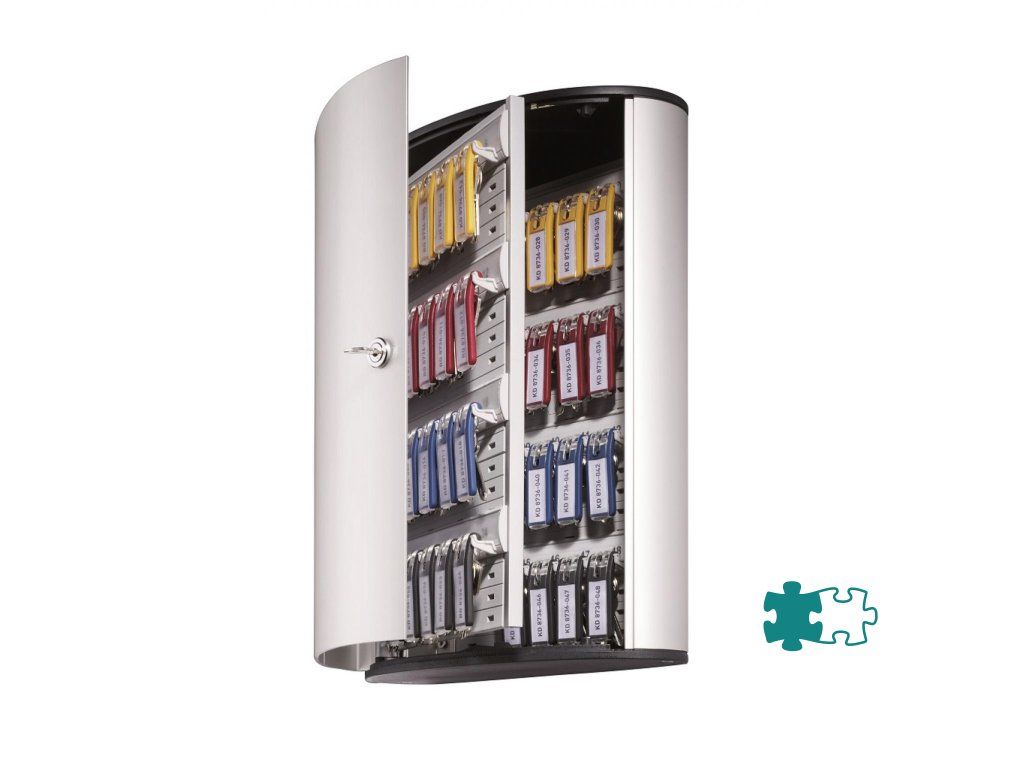 Veľká skrinka na 48 kľúčov s dvierkami, otvárajúcimi sa z dôvodu lepšej obsluhy v 180° uhle. Jednoduchá montáž na stenu. Súčasťou balenia je montážna sada, 2 bezpečnostné kľúče a 6 menoviek na kľúče v rôznych farbách. Farba strieborná.Výška: 40 cm