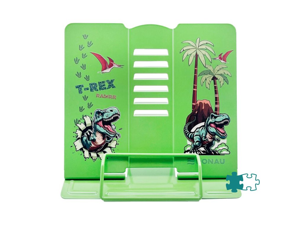 Kvalitný stojan na knihy, učebnice alebo tablet s atraktívnou potlačou Dino T-Rex. Vyrobený z odolného lakovaného kovu, ideálny aj pre ťažšie knihy. S protišmykovými úchytmi, nastaviteľná výška a uhol sklonu v 5 stupňoch. Keď sa nepoužíva, zloží sa úplne naplocho. Súčasťou je aj praktická zarážka na otvorenú stránku. Využitie nájde doma, v škole, v kuchyni, v kancelárii či ako stojan na noty. Rozmery: základňa: 21 × 16,5 cm, výška: 15,7 cm.Dodatočné parametre