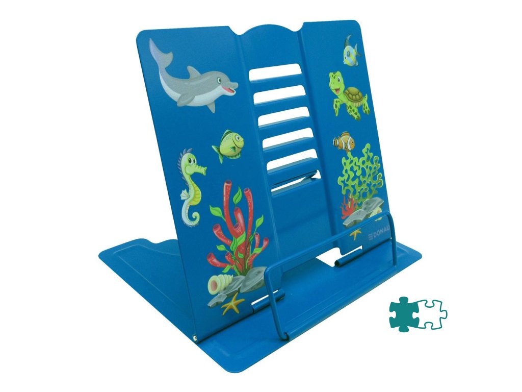 Kvalitný stojan na čítanie z lakovaného kovu, s potlačou zvieratiek, vhodný aj pre ťažké knihy a tablety, s protišmykovými gombíkmi, nastaviteľná výška/uhol sklonu v 5 stupňoch, pri nepoužívaní sa zloží na plocho pre úsporu miesta pri preprave a úložný priestor, s uzamykacou konzolou na otvorenú stranu, všestranný v škole, kancelárii, kuchyni alebo ako stojan na noty, rozmer základne 21 x 16,5cm, výška 15,7 cm, motív Zvieratká, modrý.Dodatočné parametre