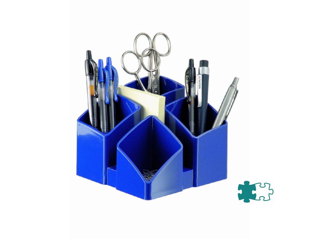 Stojan so 4 sekciami na písacie potreby a ďalšie kancelárske drobnosti. Spodná strana s protišmykovou úpravou. Materiál kvalitný plast vysokého lesku. Pri spojení 2 alebo 4 stojanov dosiahnete zaujímový moderný efekt. Rozmery 125 × 125 × 100 mm. Stojan dodávaný prázdny.Farba: modrá