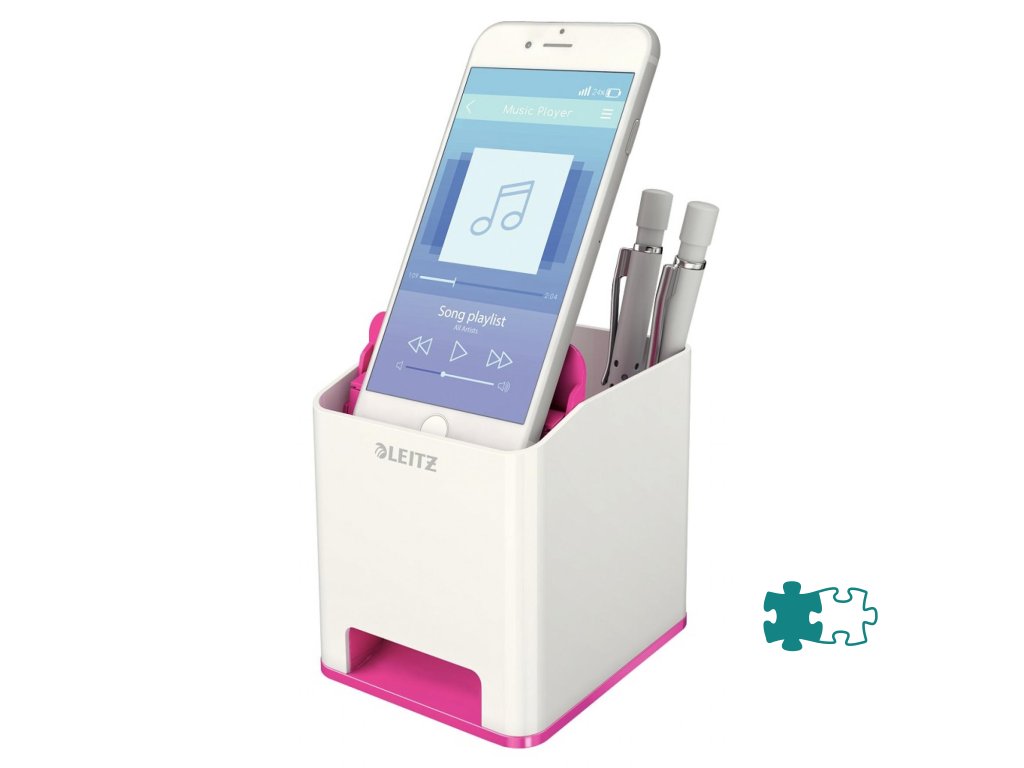 Neprehliadnuteľný štýlový stojan na perá v prémiovej kvalite Leitz v štýlových žiarivých farbách WOW. Extra odkladač pre smartphone do veľkosti iPhone 6 plus so špeciálnou funkciou pre zosilovanie zvuku, veľa miesta pre písacie potreby, pravítko, stylus a iné drobnosti. Moderný dizajn, ktorý vyzerá rovnako dobre v kancelárii, ako aj doma na pracovnom stole, dobre dopĺňa ostatné produkty radu WOW.Dodatočné parametre