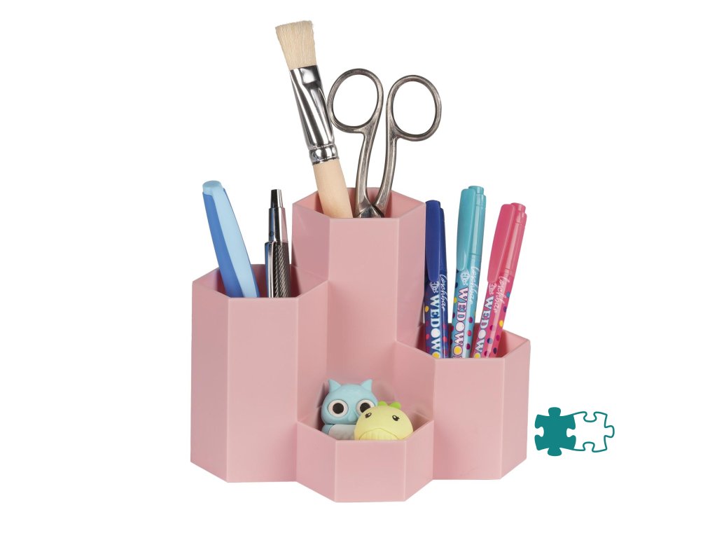 Stojan na perá so šesťuholníkovými trubicami je vyrobený z mimoriadne odolného a nárazuvzdorného polypropylénu. Vďaka tvaru včelieho plástu ho možno zoskupiť, aby sa ušetrilo miesto. 4 trubice, usporiadané v rôznych výškach, ponúkajú voľný priestor na pravítka, štetce, nožnice, perá a samozrejme aj na menšie predmety na stole, ako sú strúhadlá a gumy.Dodatočné parametre