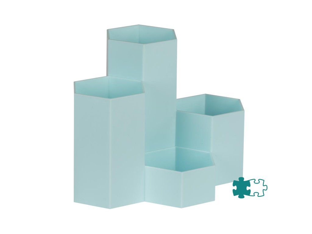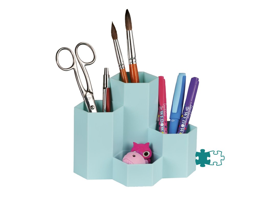 Stojan na perá so šesťuholníkovými trubicami je vyrobený z mimoriadne odolného a nárazuvzdorného polypropylénu. Vďaka tvaru včelieho plástu ho možno zoskupiť, aby sa ušetrilo miesto. 4 trubice, usporiadané v rôznych výškach, ponúkajú voľný priestor na pravítka, štetce, nožnice, perá a samozrejme aj na menšie predmety na stole, ako sú strúhadlá a gumy.Dodatočné parametre