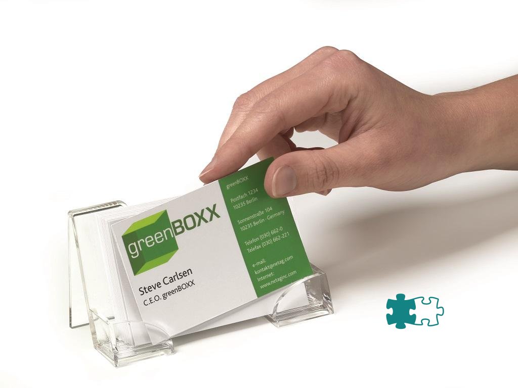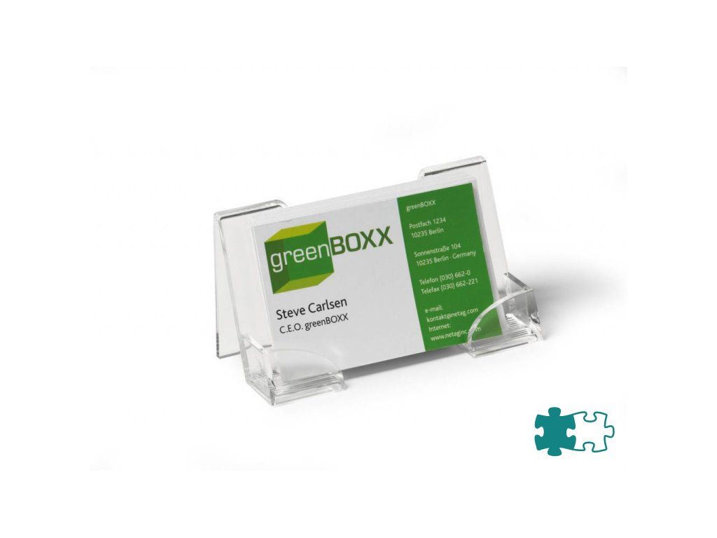 Jednoduchý a zároveň štýlový stolový stojan na vizitky. Dodávaný so samolepiacimi protišmykovými podložkami. Kapacita 50 vizitiek maximálnej šírky 100 mm. Farba číra.Kapacita: 50 vizitiek